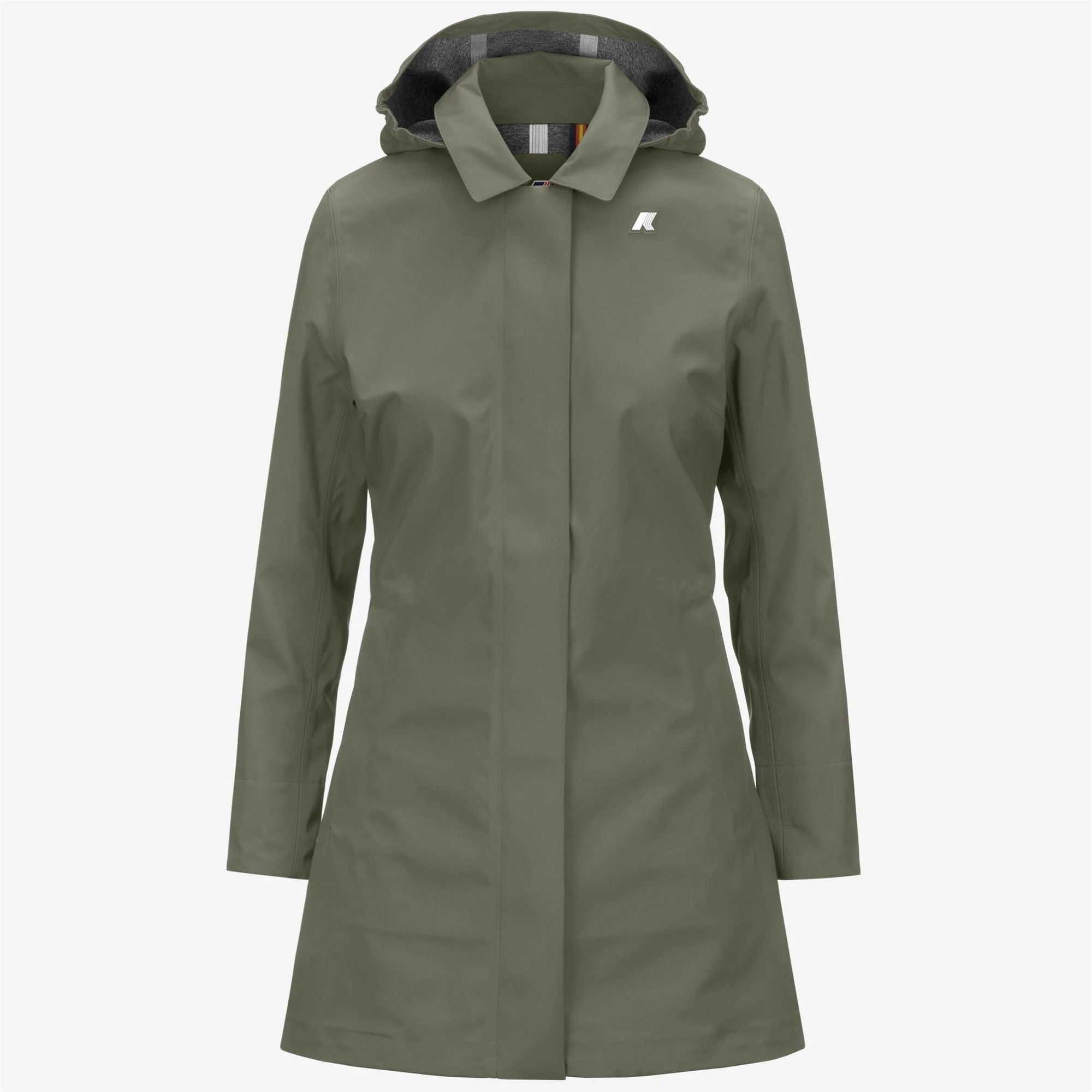 Lichen Green Women's Stylish Water-Resistant Jacket Mathy reinterprets the iconic lines of the trench coat with functional yet elegant details. Its slim-fit silhouette is elevated with a shirt collar and detachable hood: handy in the event of sudden rain. The design stands out with its three ply construction: the outer layer is made of nylon, the inner layer is an insulating membrane, and there's a comfortable jersey lining. This style, perfect for transitional seasons, is lightweight and easy to wear, while also providing excellent protection as it can withstand water resistance up to 10,000mm. - Triple-layer nylon fabric - WR (Water Repellent) treatment - Water resistance: 10000 mm water column - Breathability: 10000 g/sqm/24h - Insulating membrane - Jersey lining - Light warmth - Heat-taped seams - Zip fastening - 2 zip pockets - Slim fit - White silicone logo patch Features Description: Jackets, Mid Gender: Woman Season: Spring, Summer Composition Lining: 100% Nylon Entire: 88% Polyester, 12% Poliuretane External: 88% Polyester, 12% Poliuretane Style: K7127JW - Color: V15