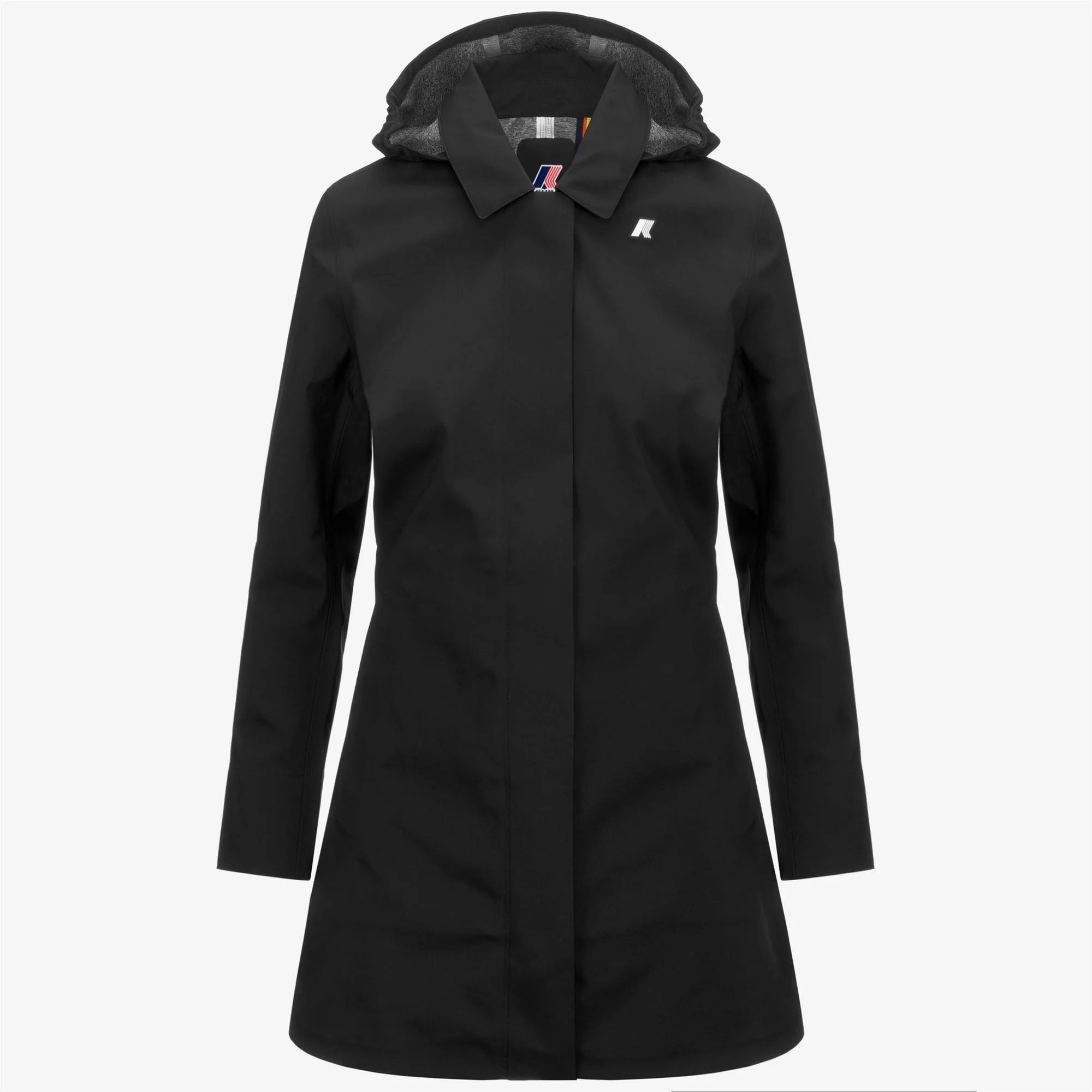 Black Grey Women's Water-Resistant Mid Jacket for City Wear Mathy reinterprets the iconic lines of the trench coat with functional yet elegant details. Its slim-fit silhouette is elevated with a shirt collar and detachable hood: handy in the event of sudden rain. The design stands out with its three ply construction: the outer layer is made of nylon, the inner layer is an insulating membrane, and there's a comfortable jersey lining. This style, perfect for transitional seasons, is lightweight and easy to wear, while also providing excellent protection as it can withstand water resistance up to 10,000mm. - Triple-layer nylon fabric - WR (Water Repellent) treatment - Water resistance: 10000 mm water column - Breathability: 10000 g/sqm/24h - Insulating membrane - Jersey lining - Light warmth - Heat-taped seams - Zip fastening - 2 zip pockets - Slim fit - White silicone logo patch Features Description: Jackets, Mid Gender: Woman Season: Spring, Summer Composition Lining: 100% Nylon Style: K7127JW - Color: USY