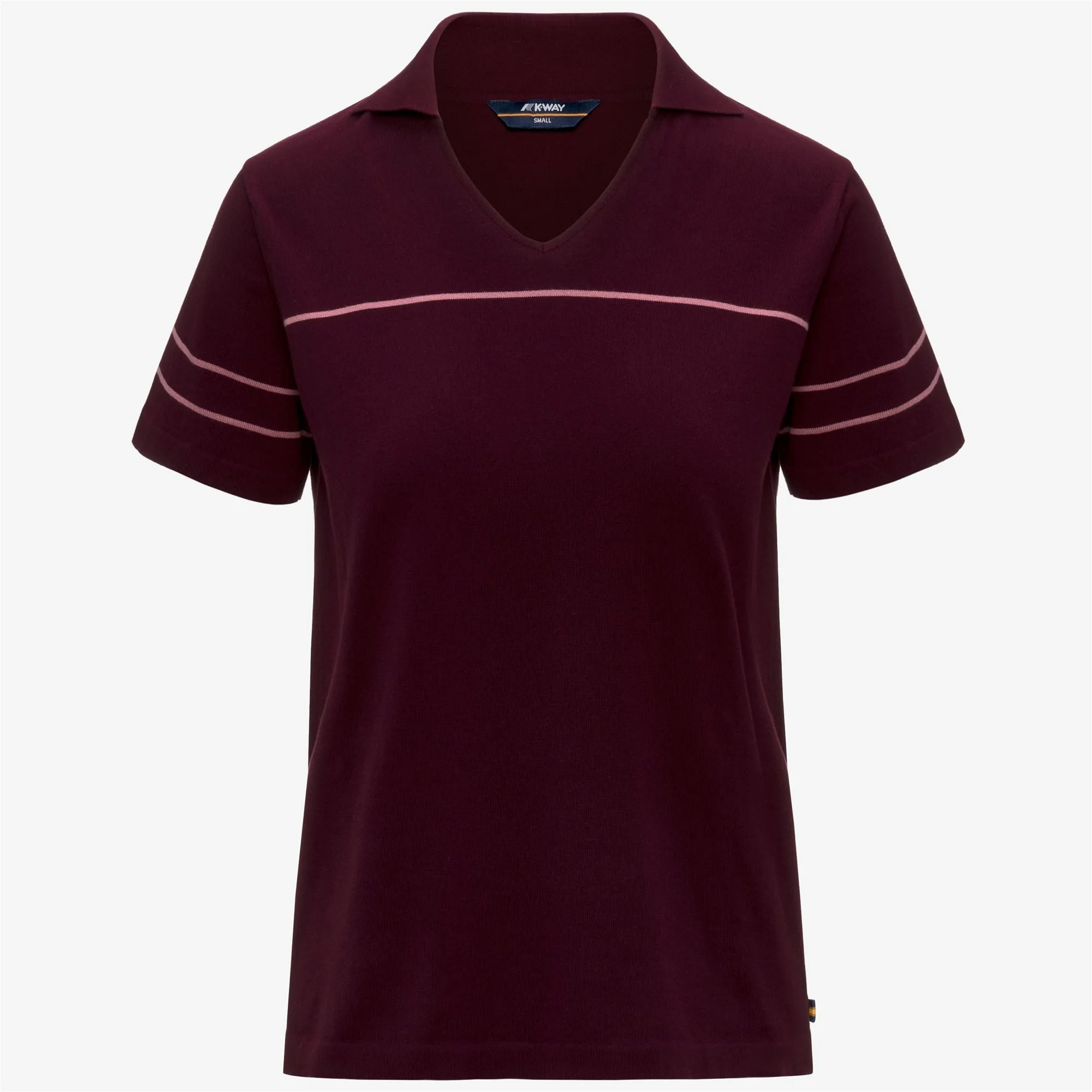 Mazardy is a women’s knit top with a neat, slightly cropped silhouette and a smooth texture enhanced by a fine horizontal stripe pattern. Made from cotton yarn, it features a V-neckline with a polo-style collar and short sleeves for a timeless, refined look. - Anti-pilling cotton yarn - Plain knit construction - V-neck with polo-style collar - Single-fold sleeve hems and bottom hem - Horizontal stripe pattern - Regular fit - K-Way tape insert at the side Features Description: KNITWEAR, Polo Gender: Woman Season: Spring, Summer Composition Entire: 100% Cotton Style: K11715W - Color: C43