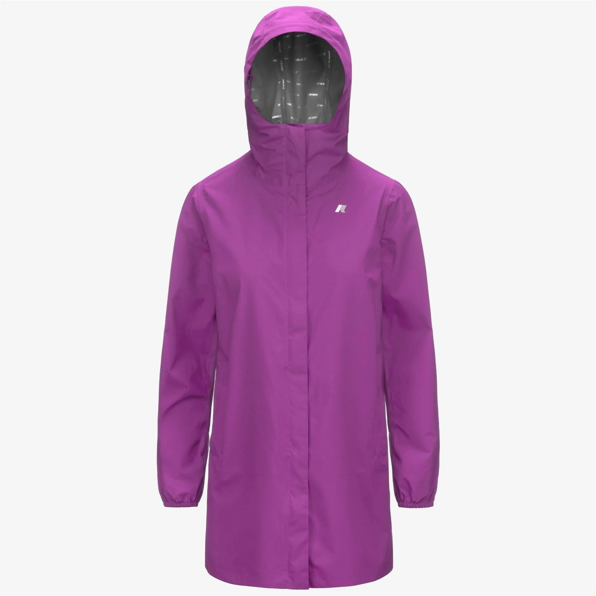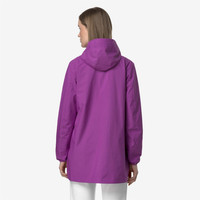 Violet Women's Slim Fit Waterproof Jacket for Variable Weather Sophie is a women's three quarter-length slim fit jacket, perfect for transitional seasons. It's crafted from stretch technical fabric that allows for unrestricted movement while providing rain and wind protection, with water resistance up to 10000 mm. The interior is lined with an insulating membrane with all-over silver-tone K-Way lettering print. Functional details, such as zipped pockets, a wrap-around adjustable hood, and elasticated cuffs ensure an easy, comfortable fit. - Waterproof, windproof and breathable stretch polyester fabric - DWR (Durable Water Repellent) treatment - Water resistance: 10000 mm water column - Logo-printed interior membrane - Heat-taped seams - Adjustable drawstring hood - Flap-covered zip fastening - Elasticated cuffs - 2 zipped pockets - Slim fit - White printed logo Features Description: Jackets, Mid Gender: Woman Season: Spring, Summer, Fall, Winter Composition Entire: 24% Poliuretane, 76% Recycled Polyester Style: K5127NW - Color: 521