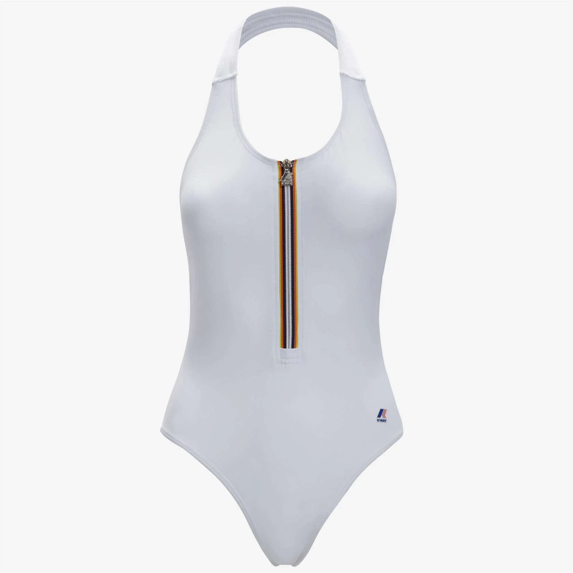 Grey White Women's Halterneck Quick-Dry Swimsuit with Zip The Sylvie one-piece swimsuit boasts a feminine halterneck silhouette with a long front zip, embellished with K-Way's iconic striped tape. Crafted from resistant quick-dry lycra®, the design is detailed with a coloured K-Way logo on the side. - Lycra® - Halterneck style - Zip with striped tape - Regular fit - Coloured silicone logo Features Description: Bathing Suits, Swimsuit Gender: Woman Season: Spring, Summer Composition External: 22% Elastane, 78% Polyamide Lining: 100% Polyester Style: K004W80 - Color: 001