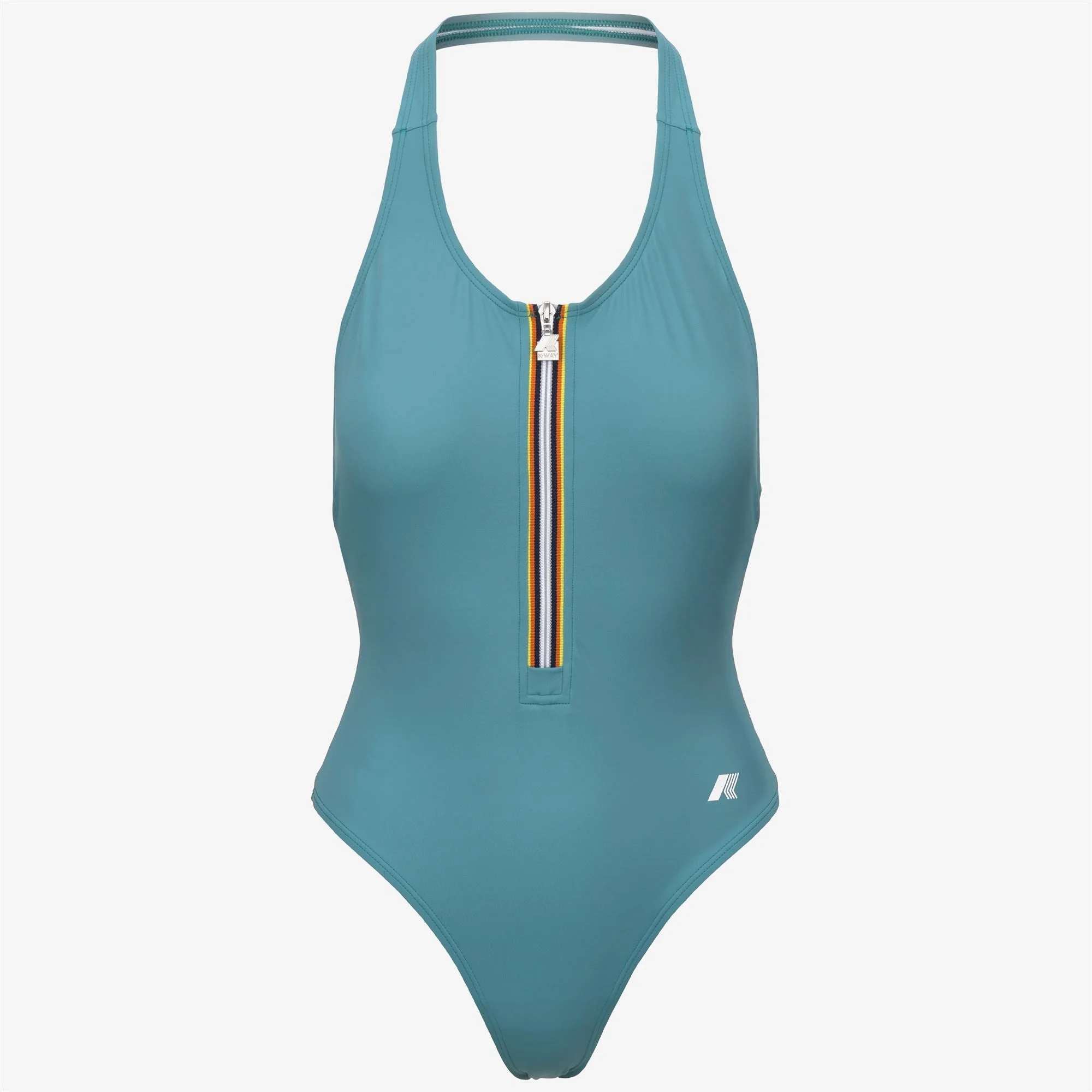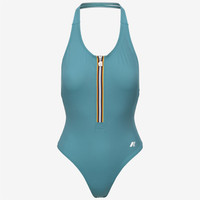 Teal green Women's Halterneck One-Piece Swimsuit with Zip The Sylvie one-piece swimsuit boasts a feminine halterneck silhouette with a long front zip, embellished with K-Way's iconic striped tape. Crafted from resistant quick-dry Lycra®, the design is detailed with a coloured K-Way logo on the side. - Lycra® - Halterneck style - Zip with striped tape - Regular fit - White printed logo Features Description: Bathing Suits, Swimsuit Gender: Woman Season: Spring, Summer Composition External: 22% Elastane, 78% Polyamide Lining: 100% Polyester Style: K1141JW - Color: WMF