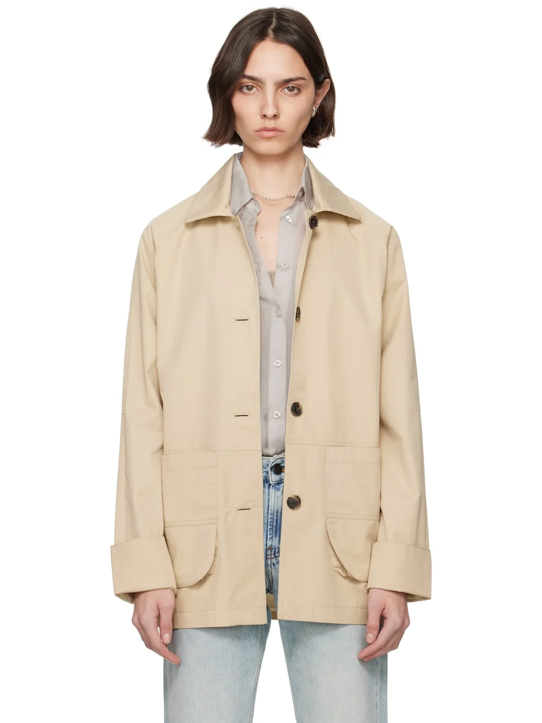 Oversized cotton- and nylon-blend gabardine jacket. · Spread collar · Button closure · Patch pockets · Button vent at side seams · Raglan sleeves · Storm flap at back · Full bemberg satin lining Supplier color: Oyster compact cotton Body: 70% cotton, 30% nylon. Lining: 100% bemberg. Made in United States 251808F063003