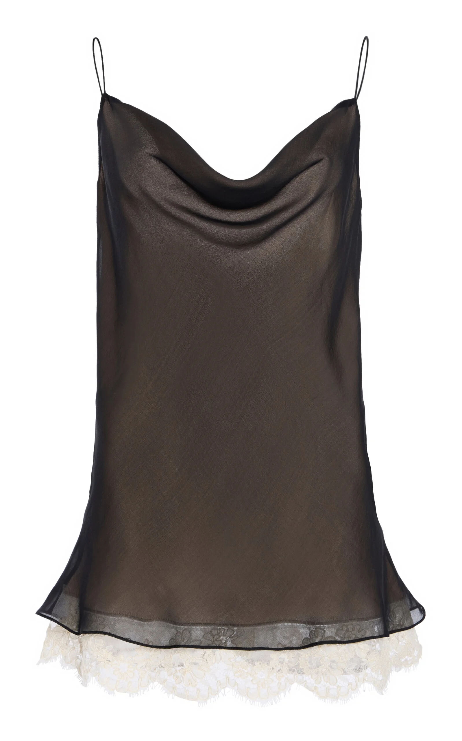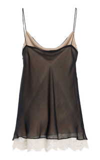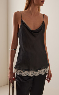 The New York-based brand revises hard-working wardrobe essentials to create elevated pieces for the modern, empowered woman. Elegant sleeveless camisole in ivory and black trapped silk with a feminine lace hem. Features a soft cowl neckline that drapes elegantly and delicate straps. Relaxed and flowing silhouette with an open back. Perfect layered under blazers or worn alone for evening. PRODUCT DETAILS - Resort '26 - Slip on - Composition: 100% silk - Dry clean only - Made in the USA SIZE & FIT - This item fits true to size