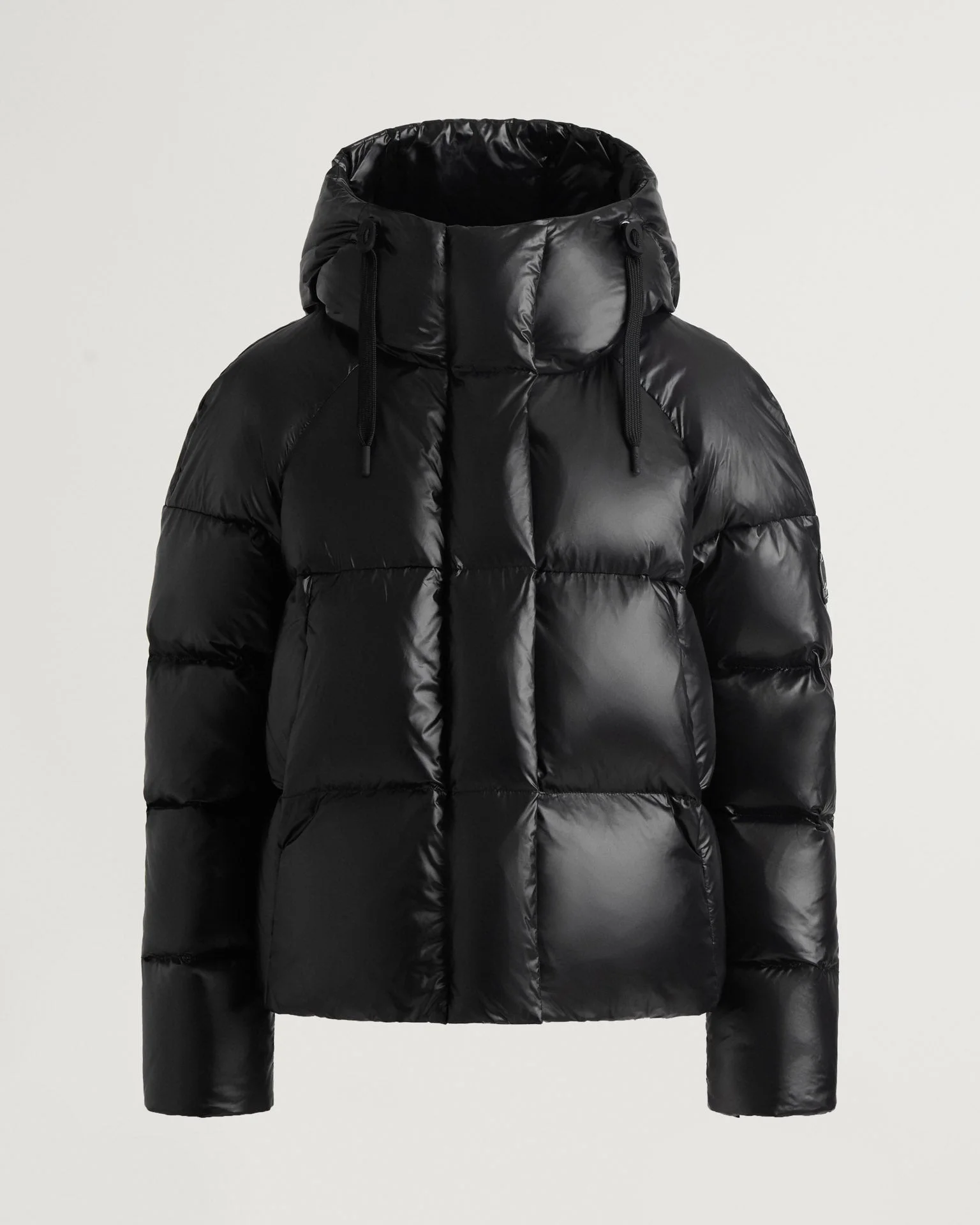 Calixa is a high-shine cropped down jacket with a relaxed fit and a fixed hood. - Comfort zone: 0°C to -10°C - Duck down fill - Concealed zipper closure with center front zip - Fixed hood Fabric details & care - Water-resistant and wind-resistant - Shell: Lustre Nylon in 100% nylon - Lining: 100% polyester - Insulation: 90/10 RDS duck down, 800 fill power - Machine wash Sizing & fit - Center back length size S: 26" / 66 cm - Relaxed fit with cropped length - Model is 5'10" and wears a size S - Fits true to size