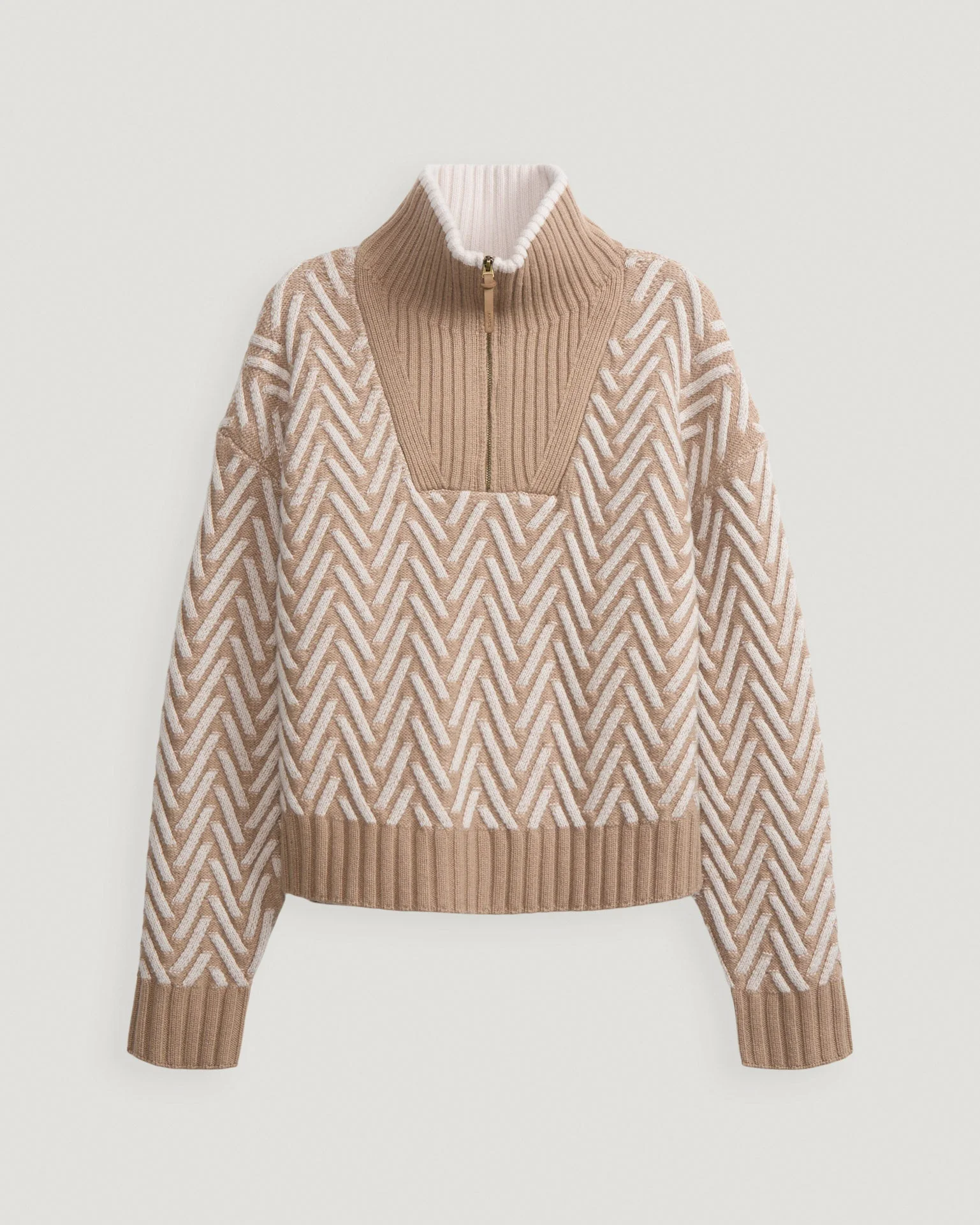 Capucine is a half-zip pullover knit in a soft wool-cashmere blend, featuring a muted two-tone effect and nubuck trim. - Wool-cashmere blend with muted two-tone finish - Nubuck trim at zip placket - Center front half-zip closure Fabric details & care - Body: Cashmere blend in 90% wool, 10% cashmere - Dry clean only Sizing & fit - Center back length for size small: 23.5" / 60 cm - Relaxed fit - Model is 5'10" and wears a size S - Fits true to size