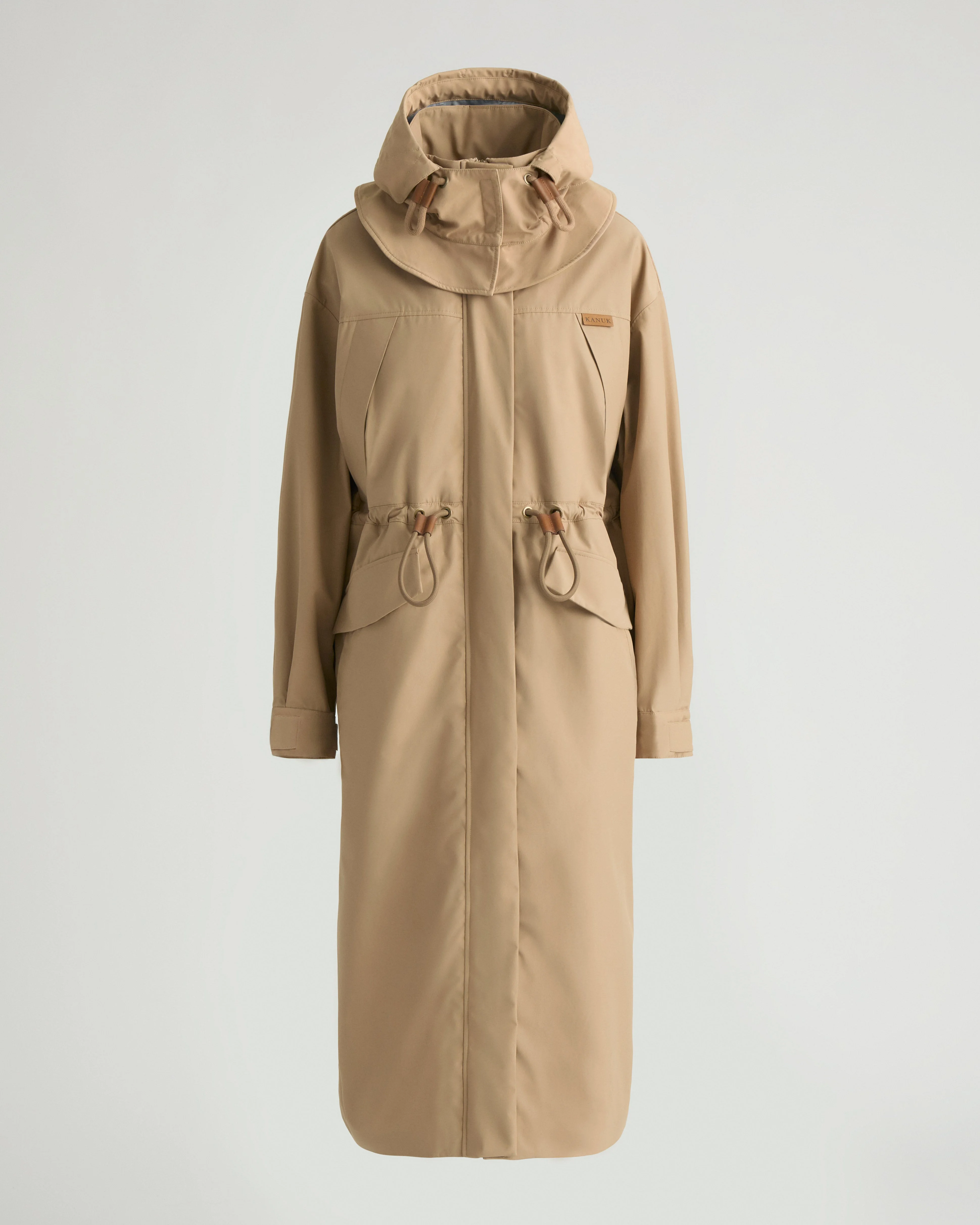 Esterel is a maxi seam-sealed rain coat with protective storm features, a removable plaid liner vest and Kanuk's iconic logo patch on the collar. - Removable hood with integrated neck gaiter - Kanuk's iconic logo patch on the collar - Wearable plaid liner vest - Seam-sealed construction - Back storm flap - Adjustable sleeve cuffs with tabs - Center front zipper and velcro placket closure - Rope drawcord for waist cinching Fabric details & care - Water-resistant, windproof, breathable - Shell: Natural Tech in 100% recycled nylon - Liner vest: Brushed Plaid in 82% polyester, 12% acrylic & 6% other fibers - Lining: 100% polyester - Dry clean only Sizing & fit - Center back length for size small: 50" / 127 cm - Relaxed fit - Model is 5'9" and wears a size S - Fits true to size