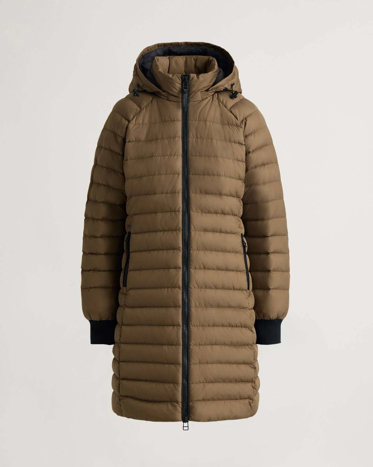Lawrence is a semi-fitted, quilted down coat with a fixed hood and storm cuffs. - Comfort zone: 0°C to -5°C - Duck down fill - Fixed hood with adjustable bungee drawcord - Center front zipper closure - Zippered side pockets and sleeve pocket - Lycra storm cuffs Fabric details & care - Water-resistant, breathable, and windproof - Shell: Soft Touch in 100% polyester - Lining: 100% polyester - Insulation: 90/10 RDS duck down, 800 fill power - Machine wash Sizing & fit - Center back length size S: 38" / 97 cm - Semi-fitted - Model is 5'10" and wears a size S - Fits true to size
