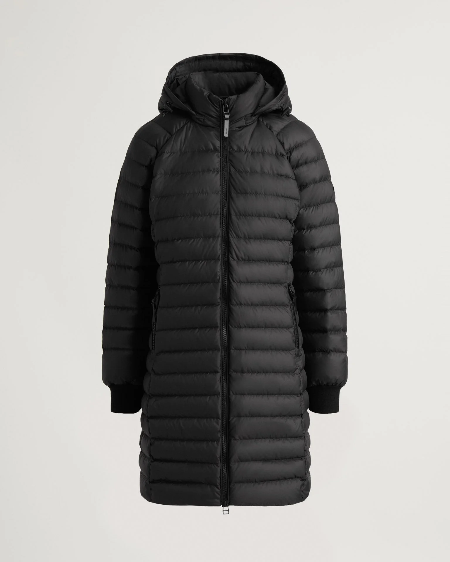 Lawrence is a semi-fitted, quilted down coat with a fixed hood and storm cuffs. - Comfort zone: 0°C to -5°C - Duck down fill - Fixed hood with adjustable bungee drawcord - Center front zipper closure - Zippered side pockets and sleeve pocket - Lycra storm cuffs Fabric details & care - Water-resistant, breathable, and windproof - Shell: Soft Touch in 100% polyester - Lining: 100% polyester - Insulation: 90/10 RDS duck down, 800 fill power - Machine wash Sizing & fit - Center back length size S: 38" / 97 cm - Semi-fitted - Model is 5'10" and wears a size S - Fits true to size