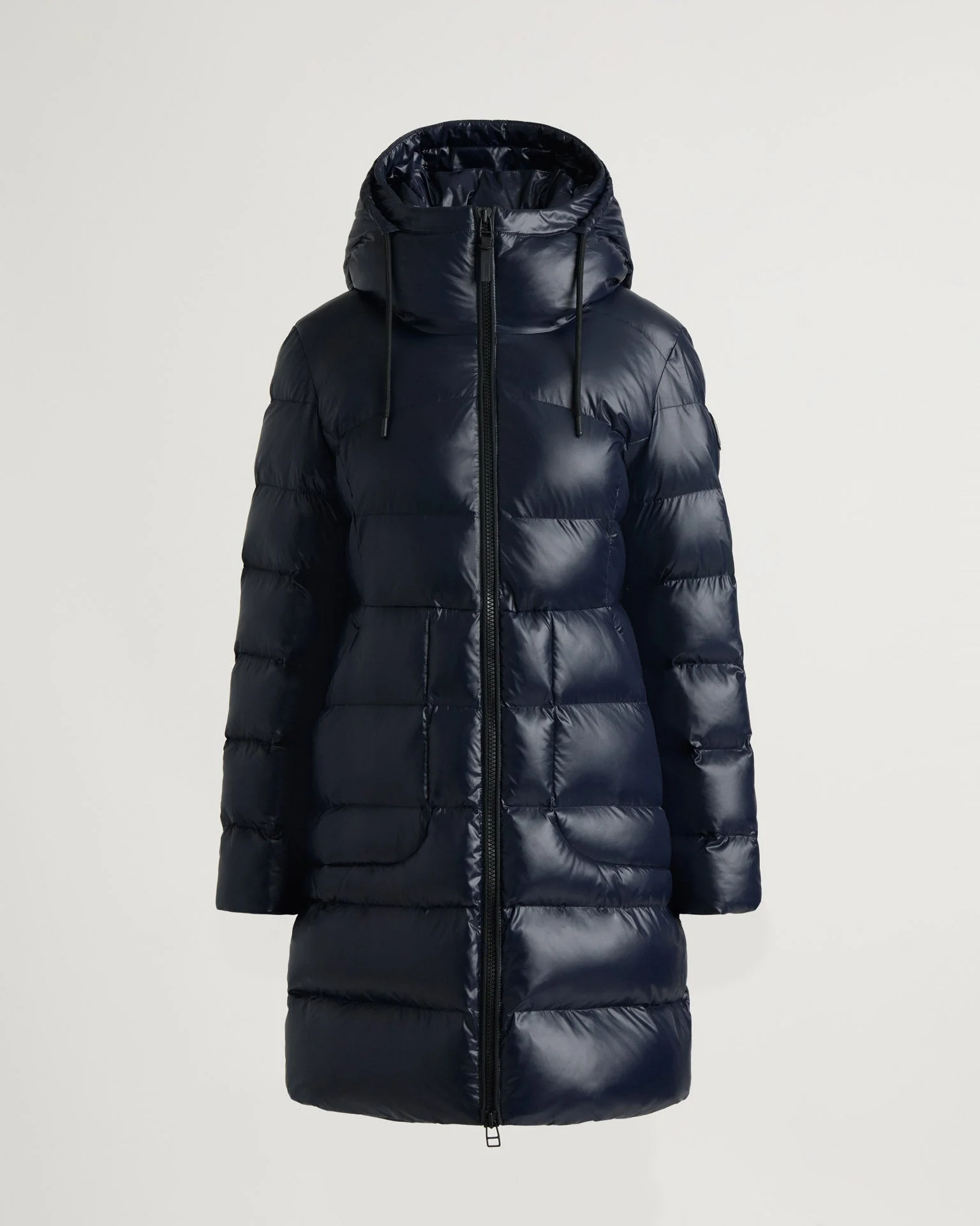 Notting Hill is a bestselling shiny longline puffer with insulation, subtle waist shaping a fixed hood, and inner collar. - Comfort zone: -20°C to -25°C - Fixed hood with adjustable drawcord - Cozy inner collar - Center front zipper closure - Zippered front pockets - Made in China Fabric details & care - Water-resistant and wind-resistant - Shell: Lustre Nylon in 100% nylon - Lining: 100% polyester - Insulation: 3M Featherless FL700 Thinsulate - Dry clean only Sizing & fit - Center back length size S: 37" / 94 cm - Semi-fitted - Model is 5'10" and wears a size S - Fits true to size