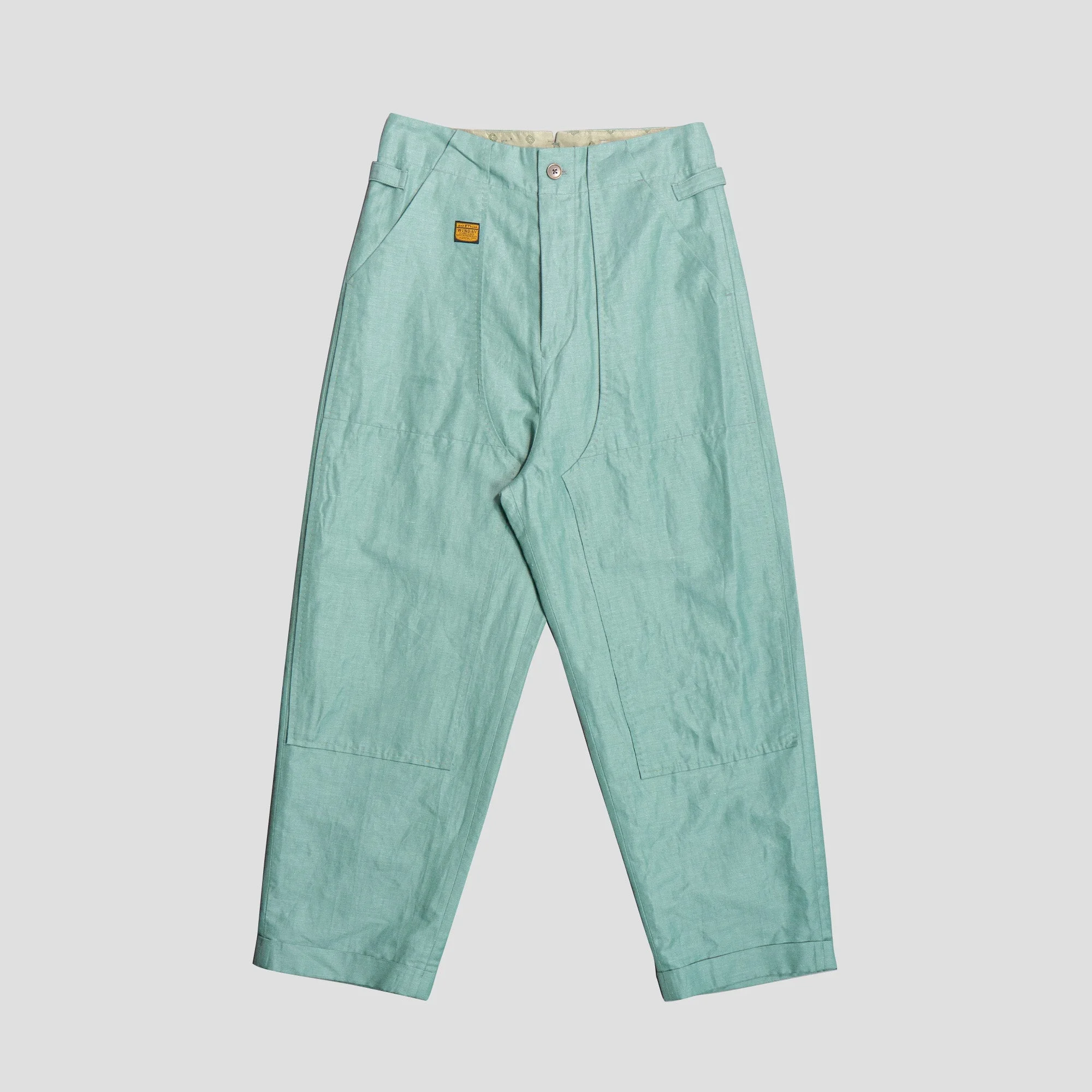 *55%Linen, 45% Cotton / Pocket Lining - 100% Cupra *Zipper Fly with Snap Button *Cinch on Waist *2 Side Pockets & 2 Back Pockets *W-Knee *Made in Japan