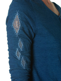 Fitted sweater in blue featuring embroidered crinoline patterns at the arm, widened crew neckline, buttoned placket, vented front, ribbed cuffs, straight hem, and tonal stitching. 100% Cotton Model wears a size 0.