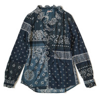 GAUZE BANDANA PATCHWORK V-NECK FRILL SHIRT - NAVY