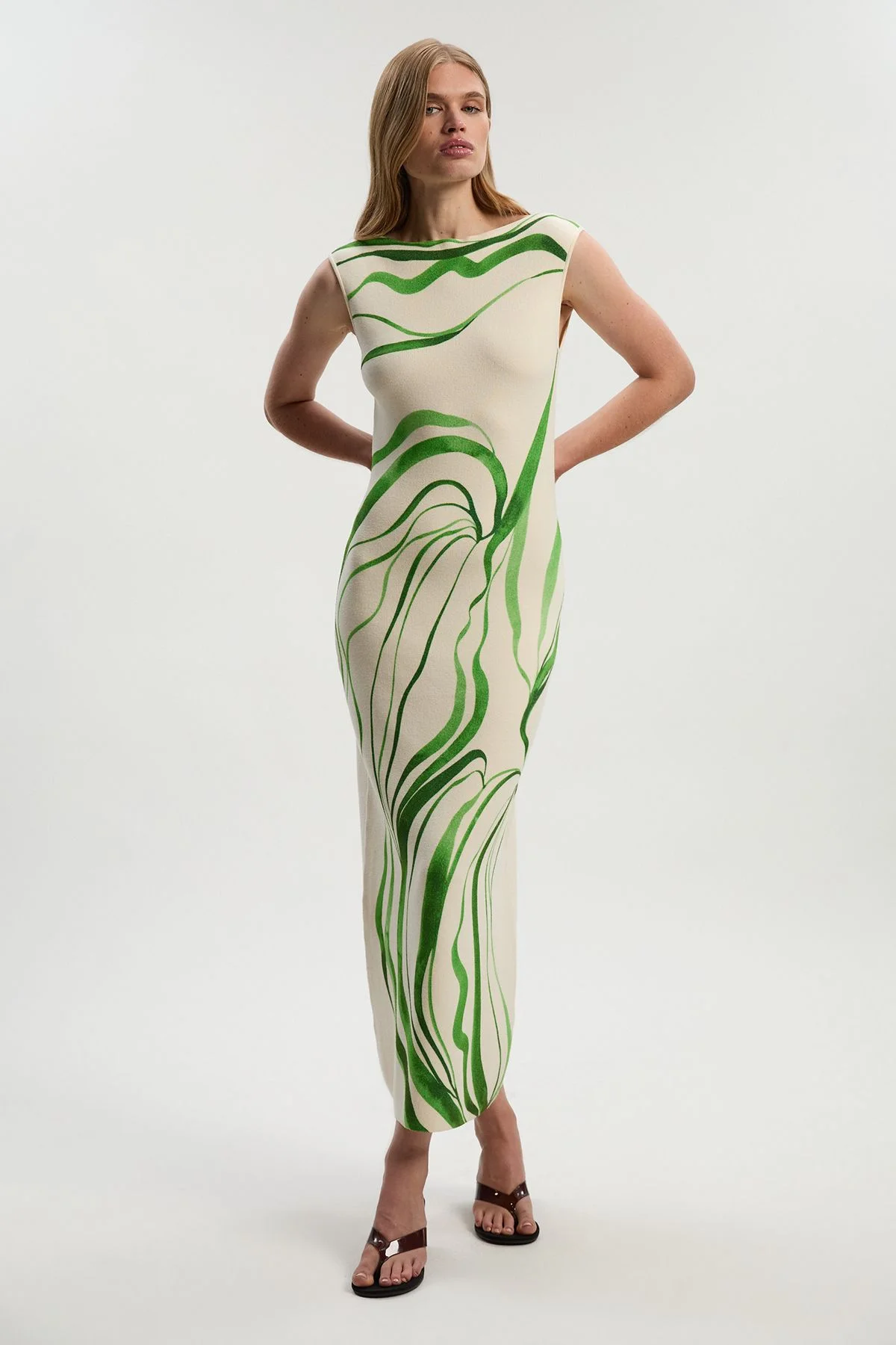 This captivating Abstract Print Knitted Maxi Dress from Karen Millen showcases artistic flair with its distinctive swirling pattern. The sleeveless design and crew neckline create a refined canvas for the eye-catching print, whilst the knitted viscose blend fabric offers both comfort and structure. This versatile piece reflects Karen Millen's commitment to contemporary design with a polished edge, making it a standout addition to your daywear collection. Abstract print knitted maxi dress Crew neckline and sleeveless design Figure-flattering knitted fabricy Full-length maxi design Product Details & Care Main: 68% Viscose/Rayon, 32% Polyester. Machine wash on a 30 degree wool cycle. Model wears UK size Small. Models heigh approx: 5"9. Length approx: 125cm.