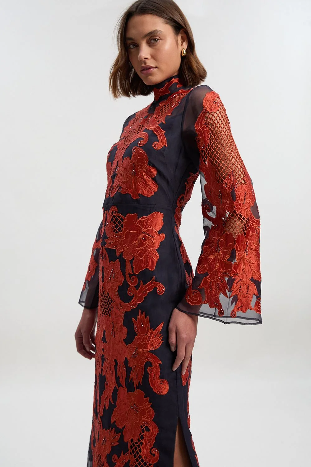 - Exquisite baroque organdie applique detailing creates a striking contrast against the sheer base fabric - Elegant bell sleeves add dramatic flair and movement to this sophisticated midi silhouette - High neckline offers a refined and contemporary look perfect for formal occasions - Intricate glass beading catches the light beautifully with every movement - Side split design provides ease of movement whilst maintaining the dress's graceful lines This Karen Millen midi dress showcases exceptional craftsmanship through its ornate baroque applique and delicate beadwork. The sheer organdie fabric creates a captivating interplay of texture and transparency, whilst the statement bell sleeves add a touch of drama to the silhouette. Style with knee-high boots as shown for a contemporary twist, or pair with strappy heels and a sleek clutch for weddings and formal events. The high neckline and midi length strike the perfect balance between sophistication and allure, making this piece ideal for races, graduations or evening soirees. The side split detail ensures comfort without compromising on elegance, allowing this dress to transition effortlessly from day to evening occasions. A true investment piece that reflects the polished yet glamorous aesthetic that defines the Karen Millen woman. Product Details & Care Shell: 100% Polyester, Lining: 100% Polyester, Trim: 100% Polyester, Bead: Glass, Embroidery: Polyester, Place in a delicates bag prior to cleaning, Model wears UK 8/US 4. Model Height 5"9. Length approx: 138cm