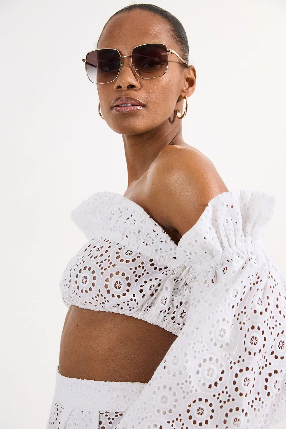 This Karen Millen Beach Woven Bardot Top combines sophistication with beachside charm. The off-shoulder design showcases your decolletage, while the eyelet detailing adds texture and visual interest to your holiday wardrobe. The versatile crop length works over your favourite bikini top when transitioning from sunbathing to beachfront dining. For cooler evenings, layer under a lightweight kimono with statement earrings and metallic sandals. This piece effortlessly transitions from poolside lounging to impromptu coastal town explorations, making it an essential addition to your holiday packing list. Bardot neckline with ruffle trim detail Intricate eyelet embroidery pattern Statement balloon sleeves for dramatic beach-ready style Cropped silhouette perfect for layering over swimwear Lightweight cotton construction Product Details & Care 100% Cotton. Wash separately. Do not bleach. Do not tumble dry. Cool iron. Do not dry clean. Model wears UK Size 8/ US Size 4. Model height approx: 5"9. Length approx: 17cm