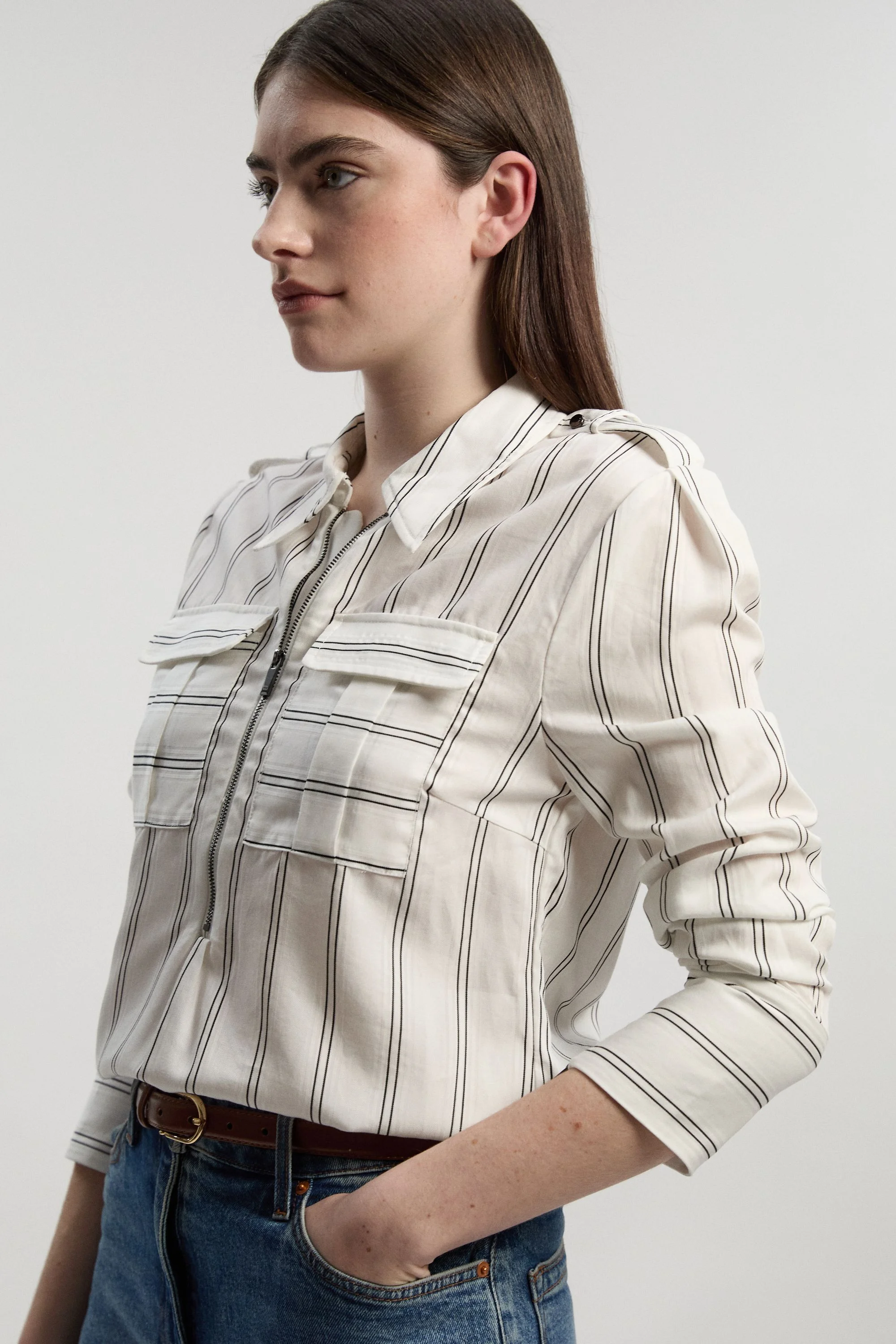 Bold Stripe Cotton Woven Utility Shirt Product Details & Care 100% Lyocell, wash with similar colours, wash inside out, iron on reverse whilst damp, Model wears UK 8/US 4. Model Height 5"9. Length approx: 66cm