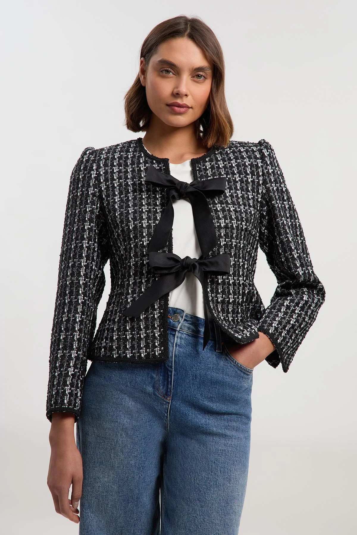- Textured boucle fabric creates a sophisticated tactile finish - Elegant bow detail adds a feminine touch to the structured silhouette - Tailored fit with peplum detail that accentuates the waistline - Round neckline offers a classic, versatile design - Cropped length perfect for highlighting high-waisted bottoms This Karen Millen boucle jacket showcases expert craftsmanship with its tailored silhouette and distinctive bow detailing. The peplum design creates a flattering shape that defines the waist whilst maintaining a polished aesthetic. Style with denim for a contemporary contrast as shown, or pair with a tailored pencil skirt for formal occasions. The textured fabric adds dimension to your ensemble, making it ideal for weddings, races or important business meetings. The versatile round neckline works beautifully with statement jewellery for evening events or can be styled with a simple blouse for daytime sophistication. This jacket embodies refined glamour that transitions effortlessly from office to evening, reflecting the contemporary elegance that defines the Karen Millen woman. Product Details & Care Shell: 100% Polyester, Contrast: 100% Polyester, Lining: 100% Polyester Machine wash at 30°C synthetic, do not bleach, do not tumble dry, cool iron, do not dry clean, wash with similar colours, iron on reverse, keep away from fire Model wears: UK10/US6. Models height approx: 5"9.