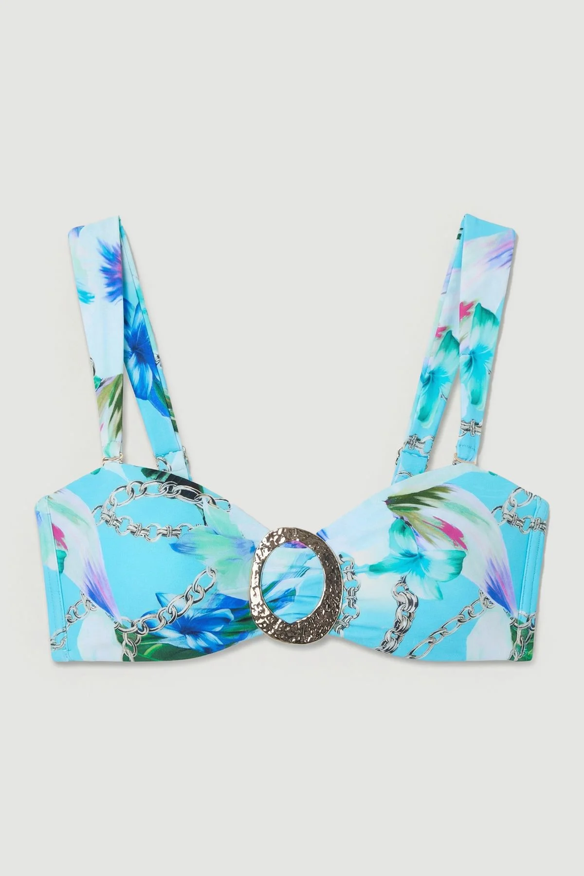 - Striking chain print bandeau bikini top with elegant metal trim detail - Structured cups provide excellent support for a flattering silhouette - Decorative metallic ring centrepiece adds a touch of sophistication - Removable halterneck straps offer versatile wearing options - Tropical floral pattern creates a bold statement for beachside confidence Make a splash poolside with this Karen Millen chain print bandeau bikini top. The eye-catching design combines tropical florals with chain print detailing for a contemporary twist on classic beachwear. The structured bandeau style features a striking metal ring centrepiece that adds a touch of refined glamour, whilst the halterneck straps provide additional support when needed. Pair with the matching bottoms for a coordinated look, or mix with plain bottoms for a more understated approach. Perfect for sun-soaked holidays, this versatile piece transitions effortlessly from lazy days by the pool to beach club socialising. The sophisticated design reflects Karen Millen's attention to detail and expert craftsmanship, ensuring you maintain that polished aesthetic even whilst relaxing in the sunshine.
