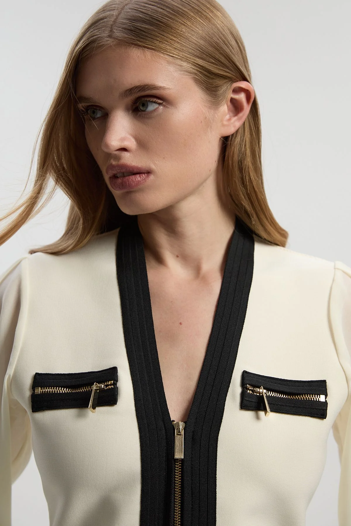 This Karen Millen Chiffon Sleeve Zip Through Bandage Knit Top masterfully blends structure with softness for a contemporary daywear piece that commands attention. The bandage knit construction offers a figure-defining fit whilst the contrasting chiffon sleeves introduce an element of graceful fluidity. The functional front zip allows you to customise your neckline depth depending on the occasion. Contrast V-neckline with bandage knit detailing Zip-through front with gold-tone hardware Chest pockets with matching gold-tone zip accents Chiffon sleeves Slim fit silhouette Product Details & Care Main 97% Recycled Polyester, 3% Elastane/Spandex. Trim 100% Polyester. Turn inside out and place in laundry bag. Model height 5"9. Model wears UK size Small. Item length 61cm.