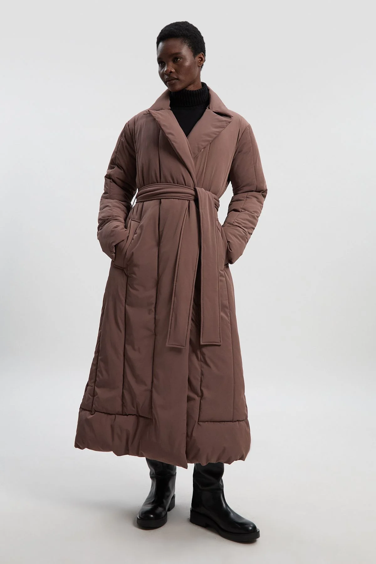 - Sophisticated padded midi coat with elegant belted waist detail for a flattering silhouette - Collared neckline adds a refined touch to this contemporary outerwear piece - Generous midi length offers exceptional coverage and warmth during colder months - Clean, minimalist design creates a versatile foundation for everyday styling - Regular fit allows comfortable layering over knitwear and other seasonal essentials This Clean Padded Belted Midi Coat from Karen Millen embodies sophisticated daywear with its streamlined silhouette and practical design elements. The defining belted waist creates a feminine shape whilst maintaining the coat's modern aesthetic. Style with a roll neck jumper and straight-leg trousers for a polished everyday look, or layer over a casual dress with chunky boots for weekend outings. The generous midi length provides excellent protection against the elements, making it ideal for city commutes or countryside walks. This versatile piece transitions effortlessly from casual family gatherings to smart-casual brunches with friends. The clean lines and considered design reflect Karen Millen's commitment to expert craftsmanship, creating a coat that will remain a wardrobe cornerstone for seasons to come. Pair with leather accessories to complete this refined yet practical ensemble. Product Details & Care main: 905% nylon, 10% elastane. Model wears UK8/U4. Model height 5"9. length approx:129cm