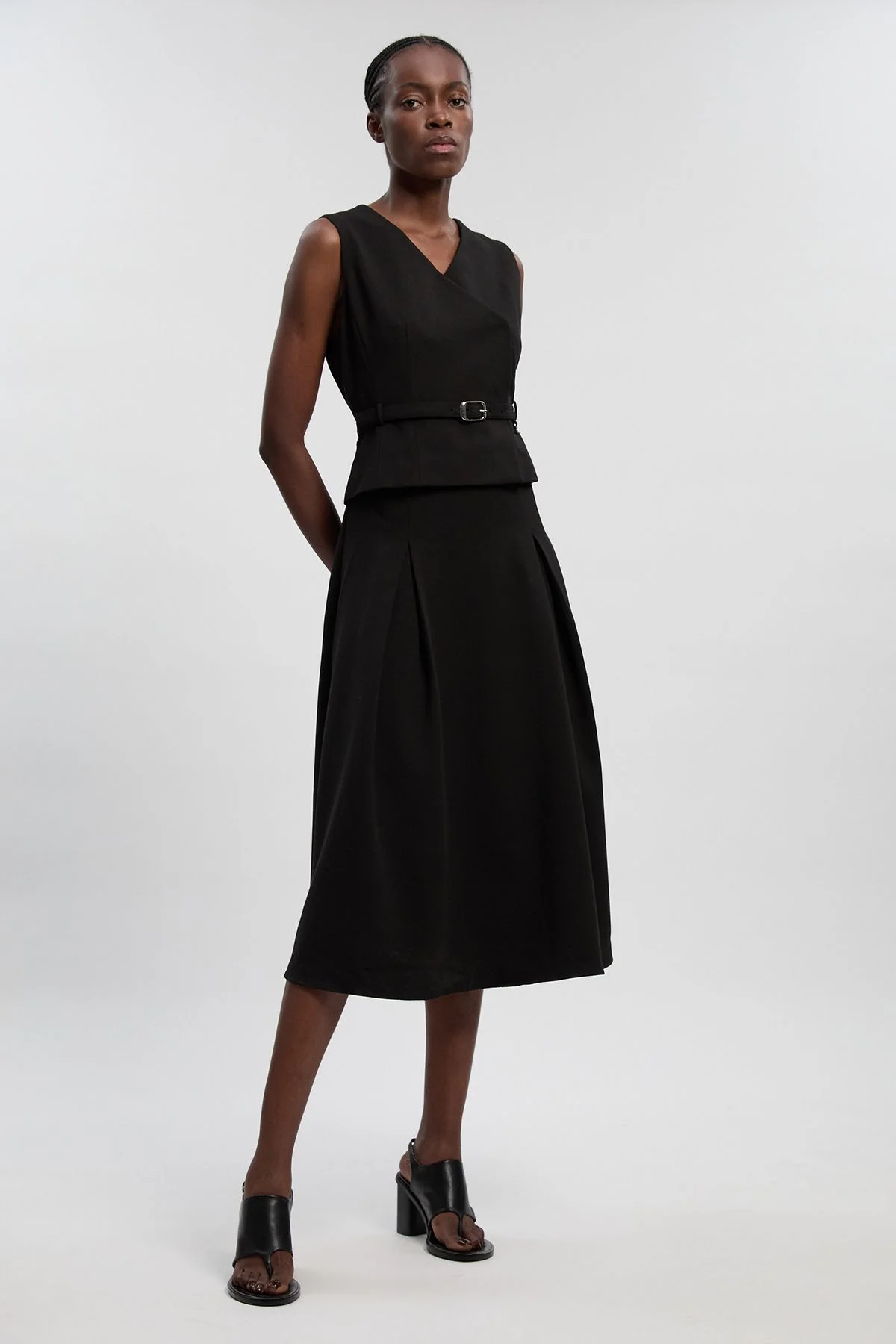 - Elegant V-neckline design with sleeveless silhouette for effortless sophistication - Structured peplum waist detail creates a flattering feminine shape - Included belt with metal buckle accentuates the waistline - Full midi skirt offers graceful movement and versatile styling options - Tailored fit with a contemporary edge, signature to Karen Millen craftsmanship This Compact Essential Belted Tailored Midi Dress embodies refined daywear with its structured silhouette and considered details. The V-neckline and sleeveless cut create a clean canvas for accessorising, whilst the peplum waist and full midi skirt deliver a beautifully balanced shape. Style with knee-high boots as shown for a contemporary daytime look with attitude, or pair with leather trainers and an oversized cardigan for casual family gatherings. The included belt allows you to customise the fit to your preference, cinching the waist for definition. This versatile piece transitions seamlessly from office to weekend brunch, making it a wardrobe essential that works throughout the seasons. Layer with a tailored blazer for cooler days or wear alone when temperatures rise - this dress offers endless styling possibilities whilst maintaining its sophisticated appeal. Product Details & Care Main: 66% Polyester, 28% Viscose/Rayon, 6% Elastane/Spandex; Lining: 100% Polyester Machine wash at 30°C synthetic cycle, do not bleach, do not tumble dry, cool iron, do not dry clean, wash with similar colours, wash inside out, iron on reverse, keep away from fire Model wears: Size 10. Models height approx: 5"9. Length approx: 122cm.