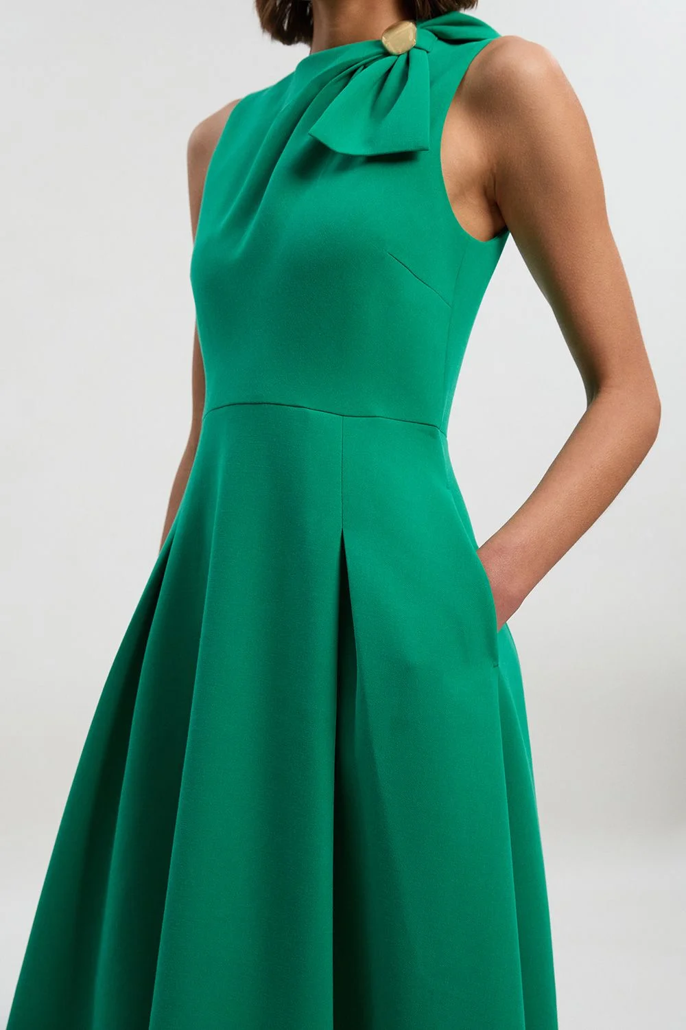 - Elegant bow tie neck detail with decorative button embellishment for a sophisticated touch - Tailored fit with structured bodice that creates a flattering silhouette - Full midi skirt design with pleating detail for graceful movement - Practical side pockets discreetly integrated into the design - Sleeveless cut perfect for showcasing statement jewellery at formal occasions This Karen Millen tailored midi dress exemplifies refined craftsmanship with its structured silhouette and distinctive bow tie neck detail. The full skirt creates a dramatic yet elegant profile that transitions beautifully from day to evening events. Style with knee-high leather boots for a contemporary twist on formal dressing, or pair with classic court shoes and a clutch bag for weddings and race day events. The versatile design makes it an excellent choice for graduations, formal dinners, and sophisticated celebrations where you wish to make a subtle statement. The stretch fabric ensures comfort throughout extended wear, whilst the tailored construction maintains a polished appearance. Accessorise with statement earrings and a sleek updo to highlight the beautiful neckline detail that sets this dress apart. Product Details & Care Main: 65% Polyester, 29% Viscose, 6% Elastane. Lining: 100% Polyester. Machine wash. Model wears: UK10/US6. Models height approx: 5"9. Length approx: 122cm.