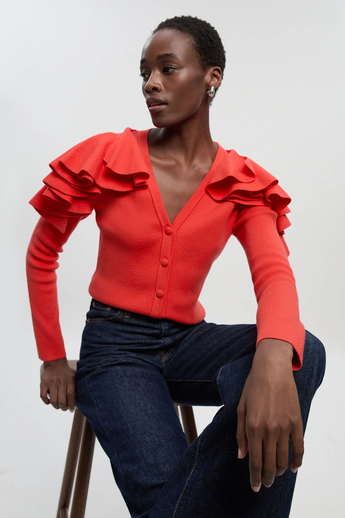 - Striking ruffle detailing across the shoulders adds a dramatic flair to this classic cardigan - Elegant V-neckline creates a flattering frame for delicate jewellery - Slim-fitting silhouette offers a sophisticated, figure-enhancing shape - Wool-blend fabric provides warmth whilst maintaining a sleek, compact appearance - Button-through front design allows for versatile styling options This Karen Millen cardigan brilliantly balances contemporary design with timeless appeal. The statement ruffle detailing transforms an everyday essential into something truly special, whilst the slim fit creates a polished silhouette that works beautifully for daywear occasions. Style with leather trousers as shown for an effortlessly chic look that transitions seamlessly from coffee dates to casual dinners. The compact wool-blend fabric offers just the right amount of structure and comfort for all-day wear. Layer over a simple camisole or wear buttoned up as a standalone top - either way, this versatile piece will quickly become a cornerstone of your casual wardrobe. Perfect for family gatherings or weekend brunches when paired with your favourite denim and elegant flats. Product Details & Care Main: 51% Viscose, 28% Polyester, 21% Polyamide. Machine wash. Due to the delicate nature of this yarn, pilling may occur during wear which can easily be removed with a depillar. Lightly steam to regain appearance. Models wears UK size Small. Models height approx: 5"9.