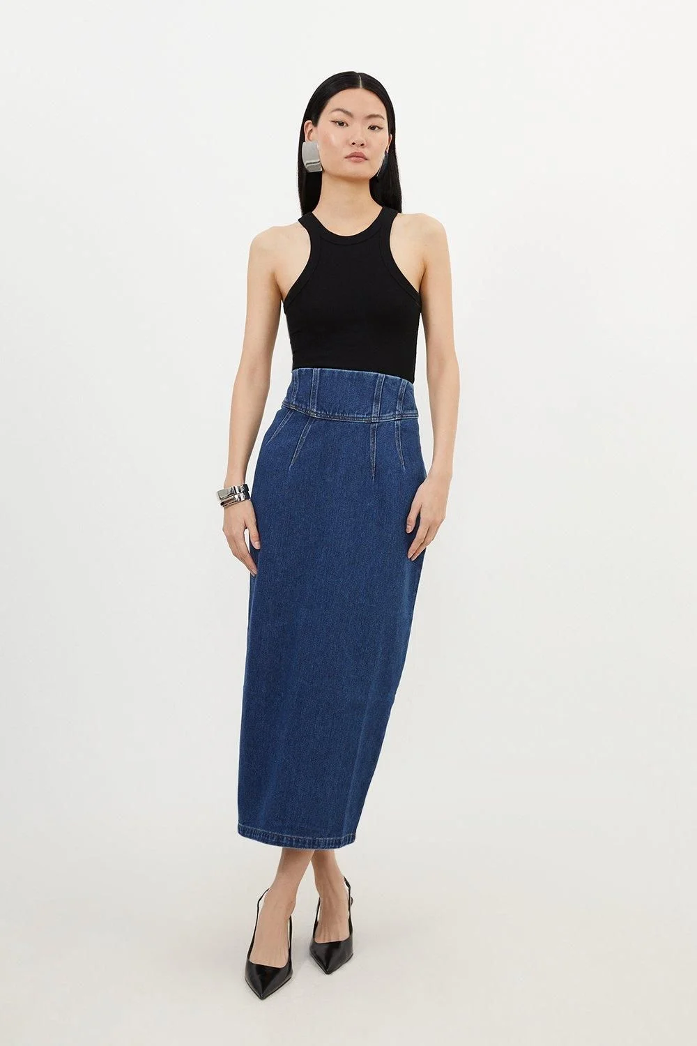 This Karen Millen Corset Waist Denim Midi Skirt combines timeless denim craftsmanship with contemporary design elements. The distinctive corset waistband cinches at the most flattering point, creating a defined silhouette that complements your natural curves. The structured nature of the fabric ensures the skirt maintains its shape throughout the day, while the midi length offers versatility across seasons. This skirt transitions effortlessly from day to evening, making it a wardrobe staple that delivers on both style and practicality. Corset-style waistband Midi length design Front button fastening Structured denim fabric Product Details & Care 59% Cotton 23% Viscose/Rayon 18% Polyester. Wash before wear to reduce possibility of colour transfer. Wash dark colours separately using non-biological liquid detergent. Avoid contact with light colours as colour may transfer. Due to the nature of the dying process there may be some colour transfer onto garments and upholstery. Model wears UK Size 8/ US Size 4. Model height approx: 5"9. Length approx: 92cm