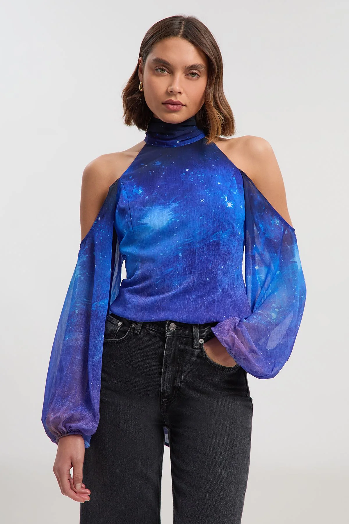 - Striking cold shoulder design with elegant high neckline - Captivating cosmic print with celestial-inspired pattern - Dramatic billowing sheer sleeves for statement appeal - Sophisticated woven fabric with gentle drape - Versatile regular fit suitable for both formal and casual styling The Cosmic Cold Shoulder Woven Blouse from Karen Millen presents a perfect fusion of contemporary design and timeless sophistication. The striking high neckline and cold shoulder detail create a flattering silhouette, whilst the billowing sheer sleeves add dramatic flair to this exceptional piece. Style with tailored black trousers and pointed court shoes for formal occasions, or take inspiration from our model and pair with classic denim for an elevated daytime look. The celestial-inspired print makes this blouse a standout choice for special events such as weddings or graduations, where its distinctive design will ensure you command attention for all the right reasons. For evening soirees, complement with statement earrings and a sleek clutch to enhance its inherent glamour. This versatile piece embodies Karen Millen's commitment to expert craftsmanship and contemporary elegance. Product Details & Care Main: 100% Polyester, Lining; 100% Polyester, wash with similar colours, wash inside out, iron on reverse, due to the delicate nature of this fabric, care must be taken with jewellery and rough surfaces, jewellery may snag this fabric, Model wears UK 8/US 4. Model Height 5"9. Length approx: 74cm