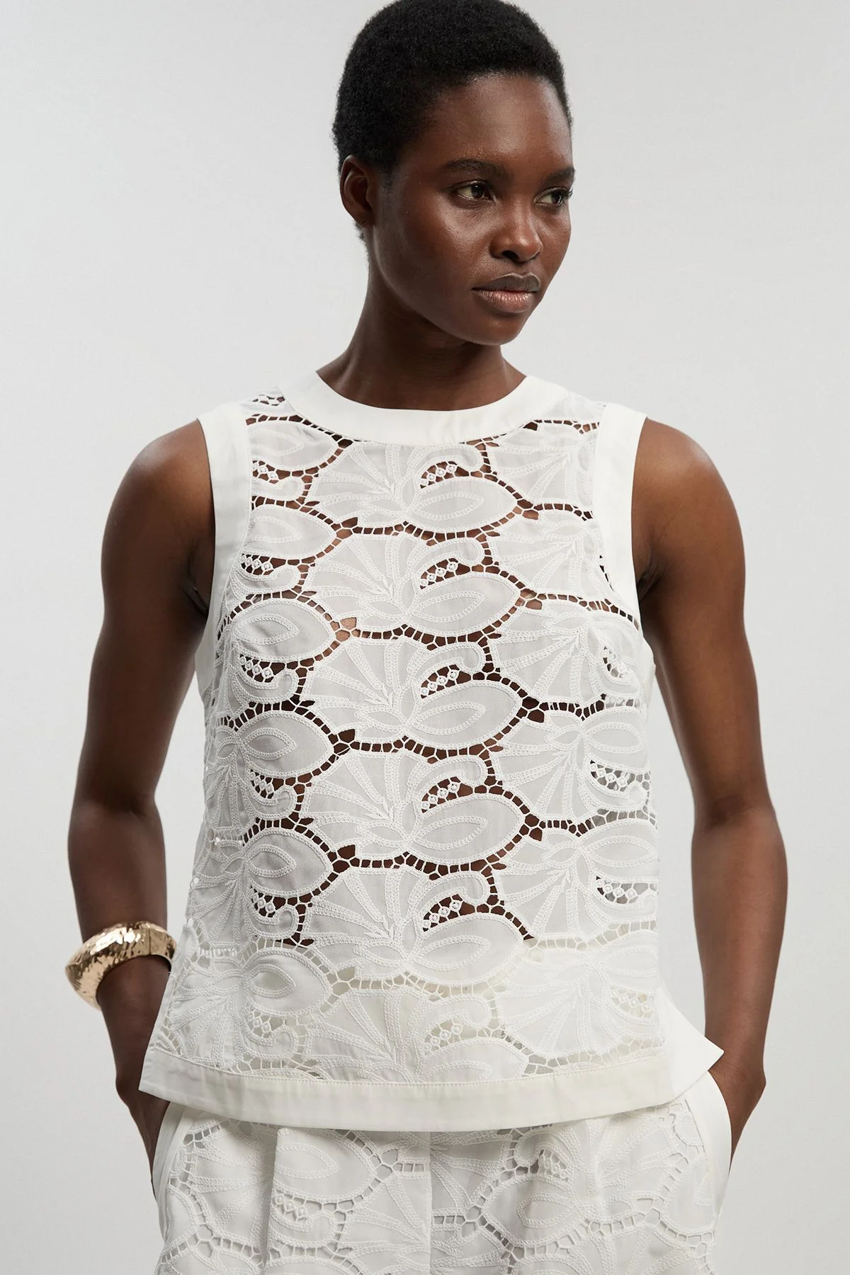 - Intricate cutwork woven pattern creates a sophisticated visual texture - Clean crew neckline offers a timeless, versatile finish - Sleeveless shell design perfect for layering or wearing alone - Neat hem detail with subtle border adds structure to the silhouette - Regular fit provides comfortable ease of movement for everyday wear This Cotton Cutwork Woven Shell Top exemplifies Karen Millen's commitment to refined craftsmanship. The delicate cutwork pattern creates an airy, textural dimension that brings contemporary elegance to casual daywear. Style with the matching bottoms as shown for a coordinated ensemble, or pair with tailored trousers and ballet flats for a sophisticated lunch date look. The versatile nature of this piece makes it ideal for family gatherings or weekend brunches-simply add a lightweight cardigan and statement bracelet to enhance its appeal. For cooler days, layer under a fitted blazer with straight-leg jeans and loafers for an effortlessly polished appearance. The pure cotton composition ensures breathability and comfort throughout the day, making this top a practical yet distinctive addition to your warm-weather wardrobe. Product Details & Care 100% Cotton. Do not tumble dry. Wash at 30. Model wears UK Size 8/ US Size 4. Model height approx: 5"9