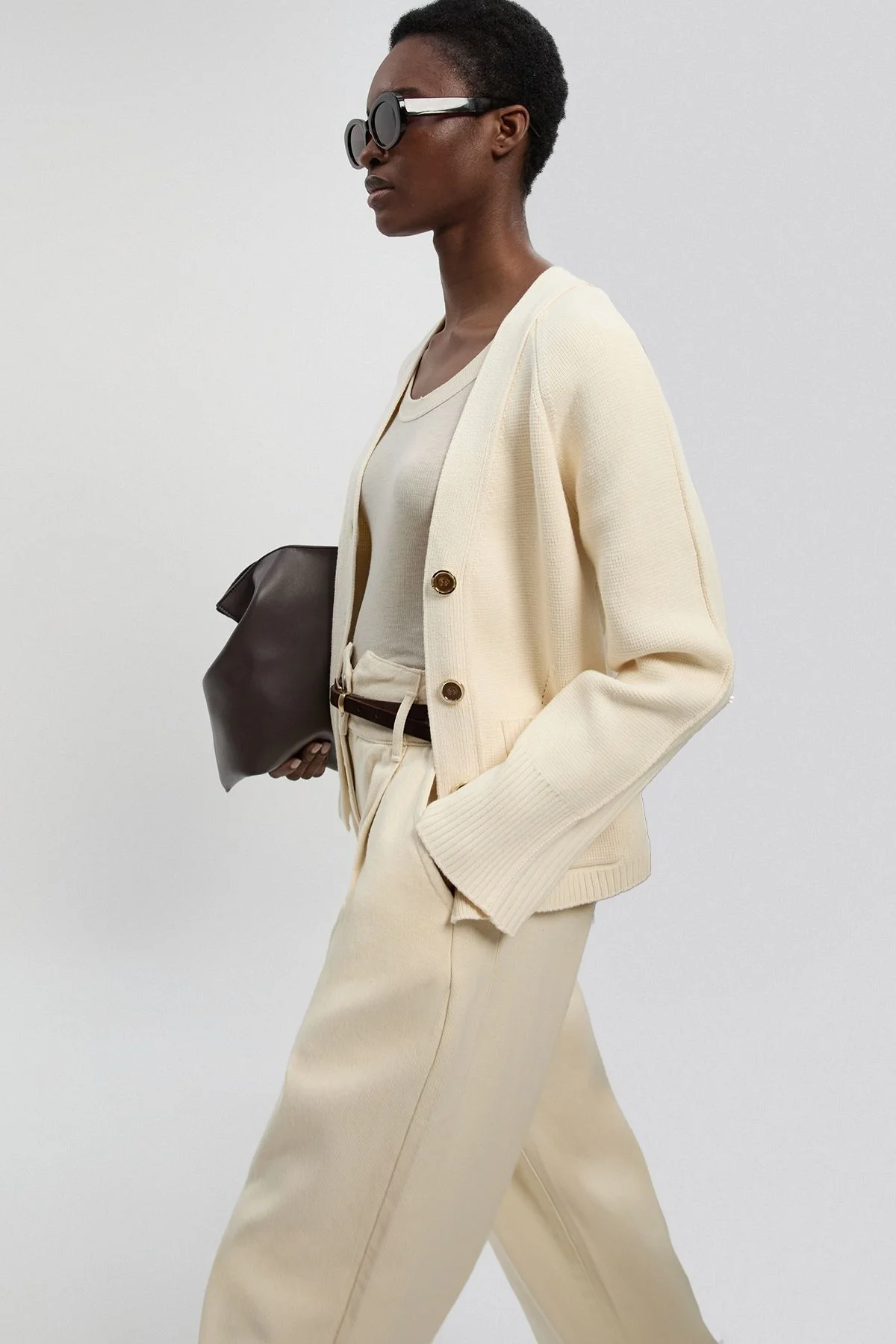 - V-neck design with elegant button-through front closure - Ribbed cuffs and hem for refined structure and shape retention - Practical side pockets for everyday functionality - Relaxed silhouette offering versatile layering options - Cotton knit construction providing breathable comfort for year-round wear This sophisticated cotton cardigan embodies effortless refinement for the contemporary woman. The clean lines and considered design make it an essential addition to your capsule wardrobe. Style with matching wide-leg trousers and a simple vest top for a coordinated monochromatic ensemble that speaks to modern minimalism. The versatile nature of this piece allows for seamless transition between settings-pair with tailored trousers and statement sunglasses for an elegant daytime look, or drape over a silk camisole with smart trousers for evening sophistication. The quality cotton construction ensures comfort whilst maintaining a polished appearance throughout the day. Perfect for those moments when you require an additional layer without compromising on style, this cardigan demonstrates expert craftsmanship with its considered proportions and thoughtful details. Product Details & Care Front: 100% Cotton. Back: 91% Cotton, 9% Polyamide. Machine wash. Models wears UK size Small. Models height approx: 5"9.
