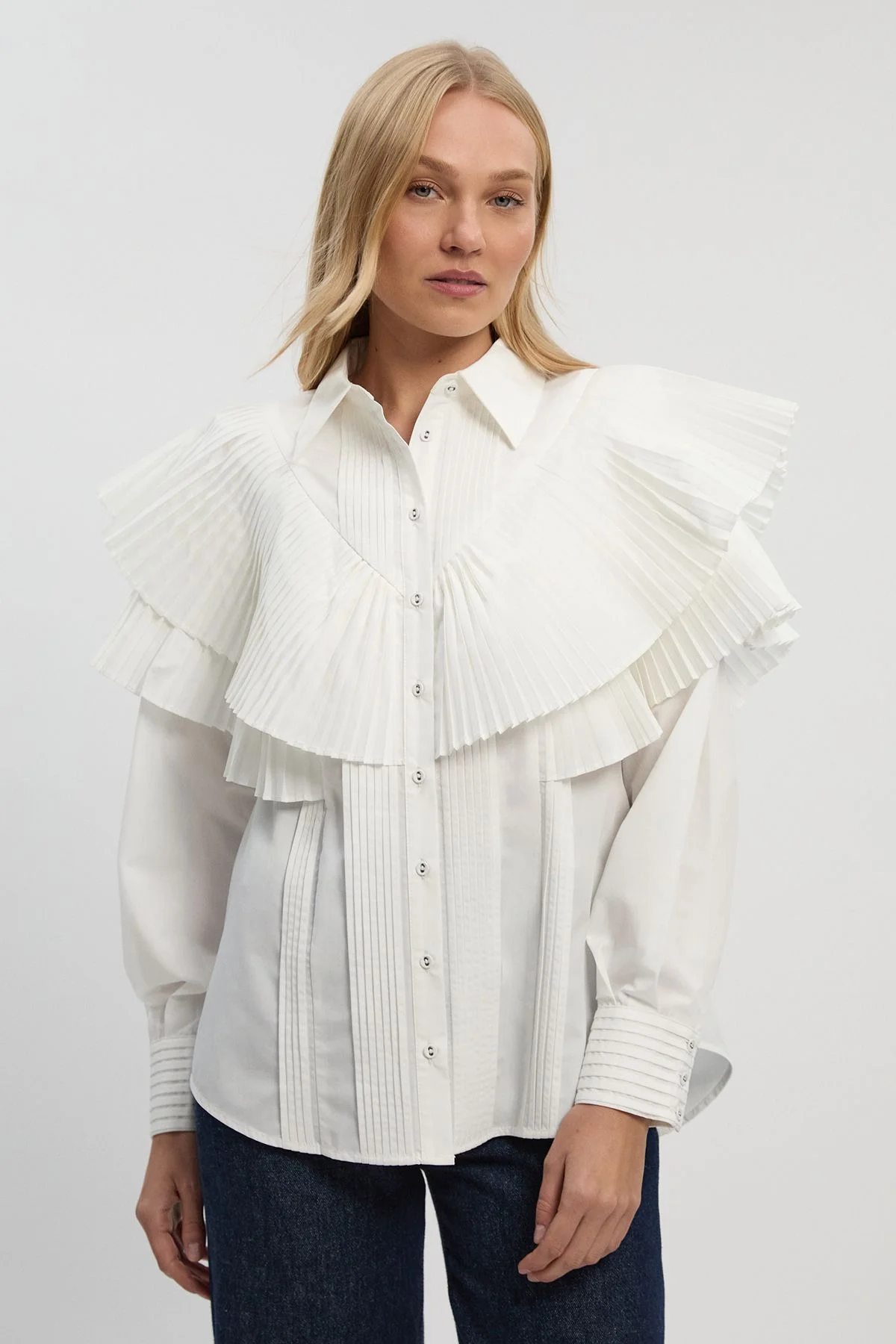 - Dramatic pleated ruffle detail across the chest creates a statement silhouette - Classic collared neckline with full button-through fastening - Elegant pintuck detailing down the front adds textural interest - Long sleeves with refined cuff detailing for a polished finish - Regular fit with a versatile 65cm length, perfect for tucking or wearing loose This Karen Millen cotton poplin shirt reimagines daywear with sophisticated drama. The standout pleated ruffle detail cascades across the chest, creating visual interest while maintaining a refined aesthetic. Style this statement piece with relaxed denim as seen on the model for an effortless contrast, or pair with tailored trousers for a more structured look. The versatile design transitions seamlessly from family brunches to casual office settings. For weekend outings, layer under a cropped jacket with ballet flats and minimal jewellery for an understated yet put-together appearance. The crisp woven fabric and architectural details reflect Karen Millen's commitment to contemporary craftsmanship, making this shirt a distinctive addition to your casual wardrobe that will carry you through multiple seasons with enduring style. Product Details & Care main: 79% polyester , 21% cotton , dry clean only , Iron on reverse , Model wears UK 8/US 4. Model Height 5"9. Length approx: 65cm