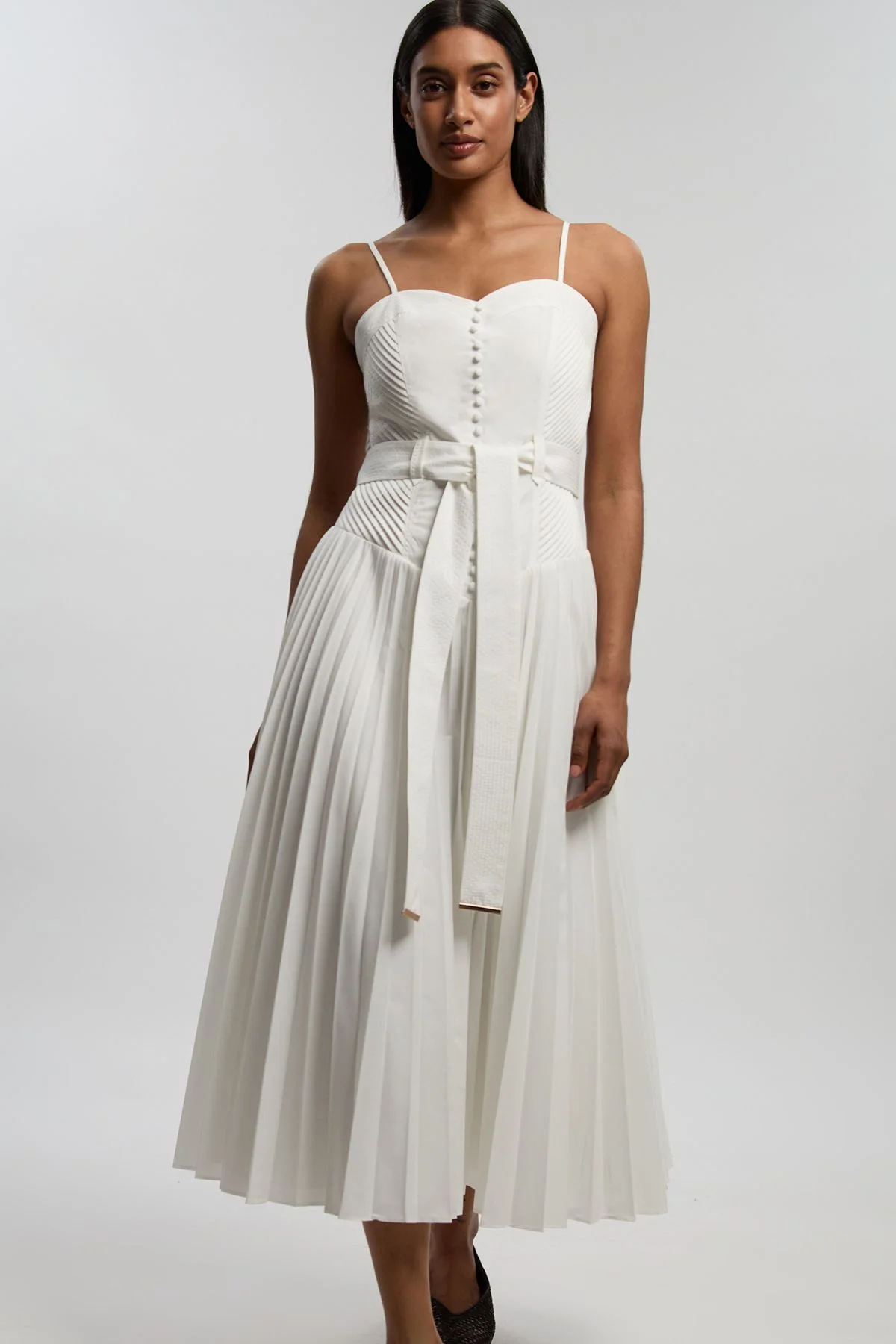- Elegant strappy midi dress with distinctive top-stitch detailing - Feminine sweetheart neckline complemented by delicate spaghetti straps - Striking directional panelling with diagonal and vertical stitching on bodice - Beautifully pleated skirt creating graceful movement and dimension - Dropped waist design with self-tie belt for a customisable silhouette This sophisticated Cotton Top Stitch Midi Dress embodies refined contemporary style with its architectural details and considered design. The structured bodice features directional stitching that creates visual interest, while the dropped waist silhouette transitions into a gracefully pleated skirt that swings with every step. Button-through detailing adds a tailored touch to this elegant piece. Style with ballet flats for daytime sophistication as shown, or transform for evening occasions with strappy heels and statement earrings. The self-tie belt allows you to accentuate your waist or wear loosely tied for a more relaxed approach. Perfect for garden parties, summer weddings or elevated daytime events where you wish to project polished femininity with a modern edge. The midi length offers versatility across seasons - layer with a tailored blazer and ankle boots during cooler months. Product Details & Care Main: 91% Polyester, 9% cotton, Lining: 100% cotton, wash inside out, wash with similar colours, Model wears UK 8/US 4. Model Height 5"9. Length approx: 132cm