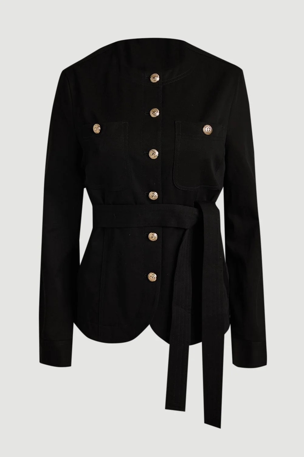 - Distinctive utility-inspired design with decorative gold-tone button detailing - Flattering tie waist belt to accentuate your silhouette - Practical front patch pockets for added functionality - Clean crew neckline offering a contemporary finish - Slim fit cut for a refined, tailored appearance This cotton utility shirt embodies sophisticated craftsmanship with its structured silhouette and considered details. The adjustable tie waist creates a customised fit that highlights your shape whilst maintaining comfort throughout the day. Style with tailored trousers and pointed court shoes for an office-appropriate ensemble, or pair with dark denim and ankle boots for elevated weekend attire. The versatile design transitions effortlessly from day to evening - simply add statement earrings and a clutch bag for after-work gatherings. Perfect for the woman who appreciates contemporary pieces with timeless appeal, this shirt offers the polished edge that defines the modern wardrobe. The button-through front allows for styling versatility, whether worn fully fastened for a smart look or partially undone for a more relaxed approach. Product Details & Care Main: 65% Lyocell, 35% Polyamide, Lining: 100% Cotton, Wash with similar colours, Wash inside out, Iron on reverse. Model wears UK 10/US 6. Model Height 5"9. Length approx: 66cm