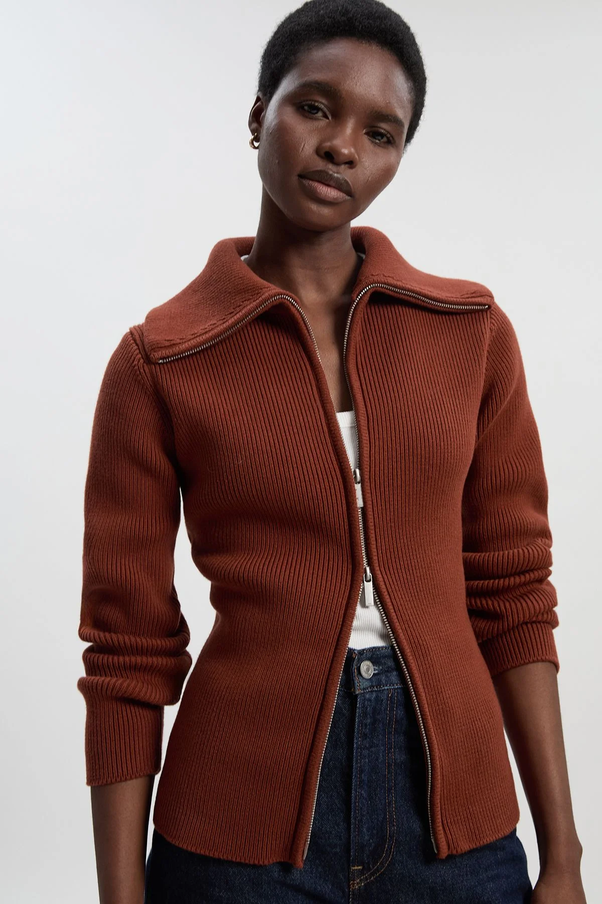 - Crafted from pure cotton for breathable comfort and natural texture - Distinctive zip-through collar design offers contemporary sophistication - Ribbed knit structure provides subtle texture and shape retention - Tailored silhouette creates a refined, feminine profile - Versatile mid-length design perfect for layering or wearing as a statement piece This cotton zip-through cardigan exemplifies Karen Millen's commitment to refined craftsmanship with its structured collar and clean lines. The ribbed texture adds dimension while maintaining a sleek silhouette that complements your daywear collection beautifully. Style with wide-leg trousers as shown for a coordinated ensemble that transitions effortlessly from morning meetings to afternoon gatherings. For weekend brunches, pair with your favourite denim and ankle boots, or layer over a simple tee with trainers for sophisticated casual outings. The zip-front detail allows for adjustable styling options-wear fully closed for a polished look or partially unzipped for a more relaxed approach. This versatile piece works wonderfully for family gatherings or casual workplace settings where comfort meets refinement. Product Details & Care 100% Cotton. Wash with similar colours, Do not bleach, Dry flat away from direct sunlight, lightly steam to regain appearance. Model wears: UKS. Model height: 5"9. Approx length: 57cm