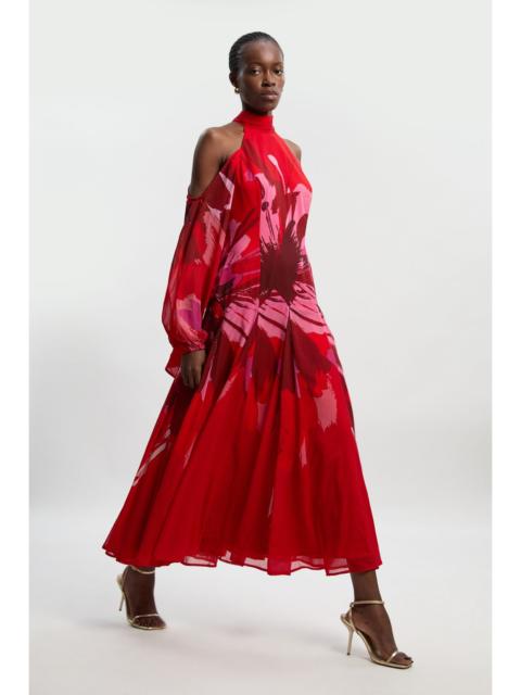 - Elegant high neck design with sophisticated cold shoulder detail - Flowing crinkle georgette fabric creates graceful movement with every step - Dramatic long sleeves balance the exposed shoulder elements - Floor-sweeping maxi length offers a refined silhouette - Subtle panelling detail enhances the feminine shape This striking maxi dress embodies contemporary sophistication with its architectural high neck and artfully placed cold shoulder cutouts. The crinkle georgette fabric drapes beautifully, creating a fluid silhouette that moves gracefully as you walk. Perfect for formal occasions, this dress commands attention at weddings, race days and evening receptions. Style with minimal jewellery to highlight the elegant neckline, and pair with strappy heels as seen on our model. Complete your ensemble with a structured clutch for a refined contrast to the flowing fabric. The dress transitions effortlessly from daytime ceremonies to evening celebrations, making it a versatile addition to your occasion wardrobe. The Karen Millen craftsmanship is evident in the thoughtful design details that create a truly memorable piece. Product Details & Care Main: 100% Polyester, wash inside out, wash with similar colours, iron on reverse, do not bleach, do not tumble dry, Model wears UK 8/US 4. Model Height 5"9. Length approx: 150cm