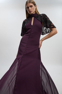 - Striking cape detail with intricate crystal embellishment and cutwork design - Elegant high neckline with keyhole front detail - Dramatic floor-sweeping maxi length with flowing silhouette - Delicate crystal trim detailing along the seams for added glamour - Sophisticated woven fabric with graceful movement Make an unforgettable entrance in this show-stopping maxi dress from Karen Millen. The exquisite crystal embellished cape creates a dramatic silhouette whilst the cutwork detailing adds artisanal flair to this formal piece. The high neckline frames the decolletage beautifully, whilst the flowing woven fabric cascades elegantly to the floor, creating movement with every step. Perfect for black-tie events, evening galas or wedding receptions, this dress commands attention without effort. Style with strappy heels as shown and a sleek clutch bag for a refined evening ensemble. For cooler evenings, drape a lightweight pashmina over your shoulders. The crystal embellishments catch the light beautifully, ensuring you shine throughout any special occasion. Product Details & Care Shell: 100% Polyester, Lining: 100% Polyester, Bead: Glass, Excluding trims: wash with similar colours, turn inside out before cleaning, do not iron embellishment, Model wears UK 8/US 4. Model Height 5"9. Length Approx: 125cm