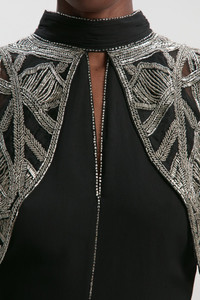 - Striking cape detail with intricate crystal embellishment and cutwork design - Elegant high neckline with keyhole front detail - Dramatic floor-sweeping maxi length with flowing silhouette - Delicate crystal trim detailing along the seams for added glamour - Sophisticated woven fabric with graceful movement Make an unforgettable entrance in this show-stopping maxi dress from Karen Millen. The exquisite crystal embellished cape creates a dramatic silhouette whilst the cutwork detailing adds artisanal flair to this formal piece. The high neckline frames the decolletage beautifully, whilst the flowing woven fabric cascades elegantly to the floor, creating movement with every step. Perfect for black-tie events, evening galas or wedding receptions, this dress commands attention without effort. Style with strappy heels as shown and a sleek clutch bag for a refined evening ensemble. For cooler evenings, drape a lightweight pashmina over your shoulders. The crystal embellishments catch the light beautifully, ensuring you shine throughout any special occasion. Product Details & Care Shell: 100% Polyester, Lining: 100% Polyester, Bead: Glass, Excluding trims: wash with similar colours, turn inside out before cleaning, do not iron embellishment, Model wears UK 8/US 4. Model Height 5"9. Length Approx: 125cm