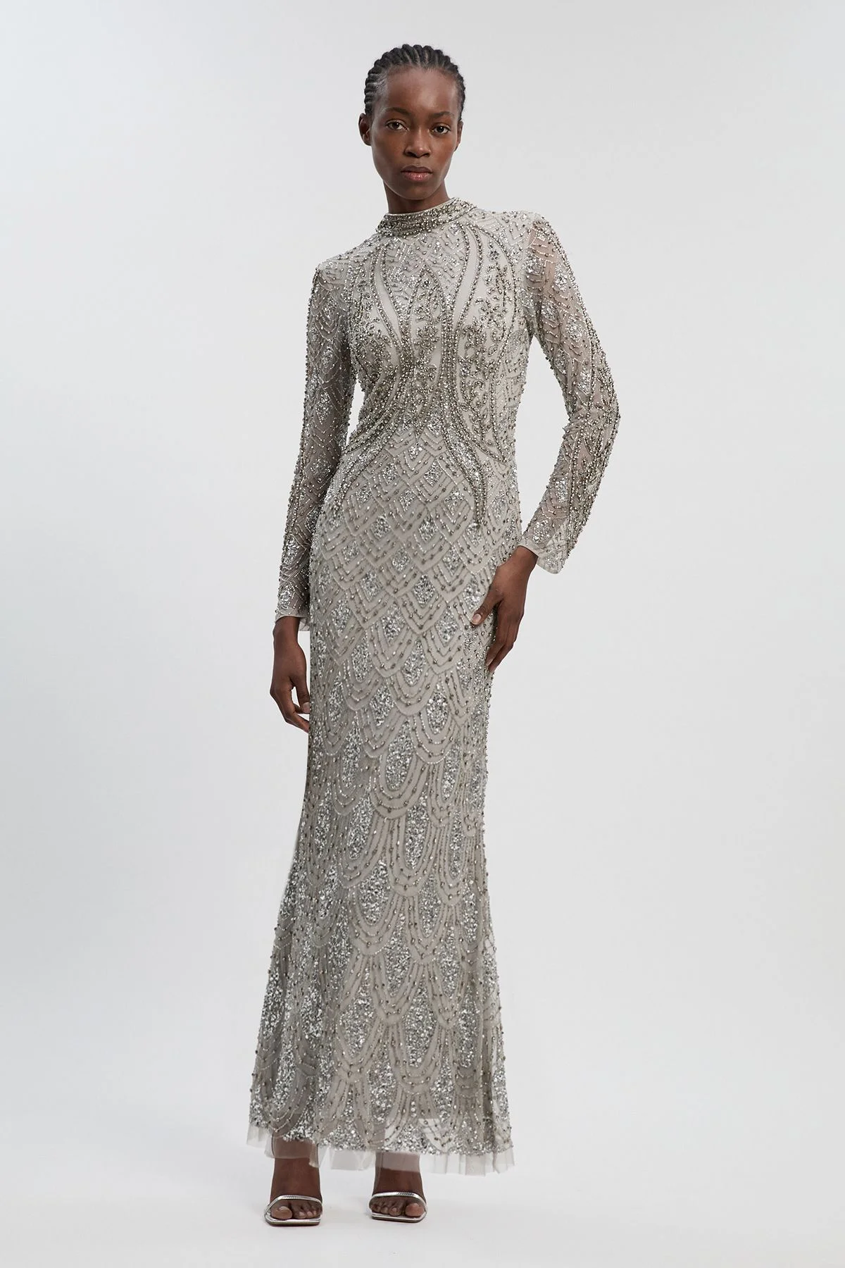 - Exquisite crystal embellishment in an intricate art deco-inspired pattern that catches the light beautifully - Elegant high neckline creates a sophisticated silhouette perfect for formal occasions - Figure-enhancing fitted bodice with clever seam detailing to flatter your shape - Long sleeves with all-over embellishment for a touch of glamour and coverage - Floor-sweeping maxi length with a subtle flare that creates graceful movement This stunning woven maxi dress showcases Karen Millen's expert craftsmanship with its meticulous crystal embellishment that creates a dazzling effect as you move. The high neckline and long sleeves offer sophisticated coverage whilst maintaining a contemporary edge. The dress features a beautifully tailored silhouette that contours the body before gently flaring towards the hem, creating an elegant line that's both flattering and comfortable for extended wear. Style with minimal accessories as demonstrated in the image - simple strappy heels and a sleek updo allow the dress to command attention. Perfect for weddings, black-tie events, galas or any special occasion where you wish to make a refined statement. The timeless design ensures this piece will remain a treasured part of your formal wardrobe for years to come. Product Details & Care Main 100% Polyester/ Lining 100% Polyester. Machine wash with similar colours. Model wears UK 8/US 4.