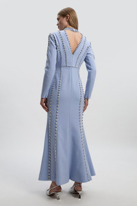 - Striking crystal embellishments adorn the entire dress, creating a captivating pattern that catches the light with every movement - Elegant plunge neckline with high collar detail adds sophisticated drama to this statement piece - Flattering fitted silhouette with expertly placed seams that contour the body beautifully - Long sleeves feature distinctive cut-out shoulder details for a contemporary twist on formal dressing - Floor-sweeping maxi length with a subtle fishtail hem creates a graceful silhouette perfect for special occasions This breathtaking woven maxi dress from Karen Millen exemplifies sophisticated glamour with its meticulous crystal embellishment work. The striking combination of a modest high collar with a daring plunge detail creates an intriguing visual contrast that commands attention. The dress's tailored construction sculpts and flatters the figure, while the strategic placement of embellishments accentuates the body's natural contours. Perfect for weddings, galas, and formal evening events, this piece requires minimal accessorising-simply pair with refined metallic heels and a sleek clutch. The unique shoulder cut-outs add a contemporary element to this otherwise classic silhouette, demonstrating Karen Millen's commitment to craftsmanship with a modern edge. This is a truly investment-worthy piece that will remain a treasured part of your occasion wardrobe for years to come. Product Details & Care Main: 91% Polyester, 9% Elastane, Lining: 90% Polyester, 10% Elastane, Embellishment: Glass, Do not iron embellishment, Iron on reverse, Place in a delicates bag prior to cleaning, Professional dry clean only, Due to the nature of this fabric, care must be taken with jewellery and rough surfaces, jewellery may snag this fabric, Model wears UK 8/US 4. Model Height 5"9. Length approx: 135cm