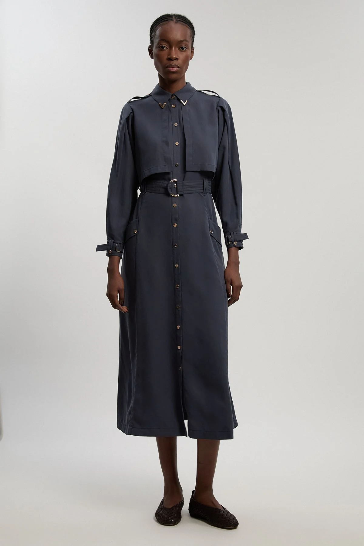 - Distinctive utility-inspired shirt dress with full button-through design - Structured collar with metallic tips for a contemporary edge - Belted waist detail creates a flattering silhouette - Practical utility pockets add functional style elements - Elegant midi length with a sophisticated straight cut This cupro twill woven shirt dress embodies refined utility chic with its structured silhouette and considered details. The belted waist creates definition whilst the full button-through design allows for versatile styling options. Wear buttoned up with ballet flats for an understated daytime look, or open over a fitted top with heeled boots for evening sophistication. The thoughtful design features, including the distinctive collar with metal tips and adjustable cuffs, demonstrate Karen Millen's commitment to expert craftsmanship. Perfect for transitional weather, this piece works beautifully for gallery visits, upmarket brunches or informal business meetings. Layer with a tailored blazer and add statement jewellery to transform this versatile dress for more formal occasions. Product Details & Care 75% Lyocell, 15% viscose, 10% linen, wash with similar colours, wash inside out, Model wears UK 8/US 4. Model Height 5"9. Length approx: 136cm