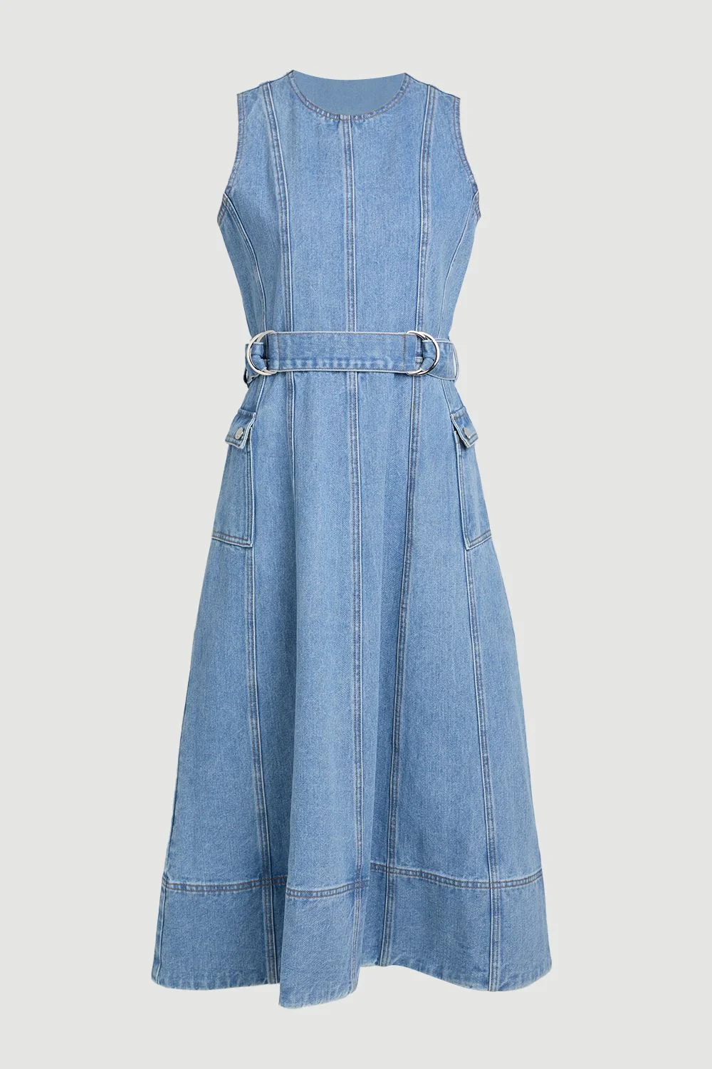 - Distinctive dropped waist design with full skirted silhouette for a contemporary take on classic denim - Sleeveless round neck bodice with vertical seam detailing for a structured, flattering fit - Midi length reaching approximately 120cm for elegant proportion - Practical side pockets add functionality to this sophisticated piece - Statement D-ring belt detail defines the waist and adds a modern hardware element This denim midi dress combines timeless appeal with contemporary design elements for a piece that transitions effortlessly from day to evening. The structured bodice with its clean lines and vertical seaming creates a refined silhouette, while the dropped waist and full skirt add movement and drama. Style with white trainers and a crossbody bag for weekend brunches or shopping trips. For a more polished daytime look, pair with block-heeled sandals and statement earrings. When evening calls, transform this versatile piece with pointed court shoes and a tailored blazer. The cotton-rich fabric offers comfort and durability, making this a wardrobe staple that maintains its shape wear after wear. Perfect for those seeking sophisticated yet practical dressing, this Karen Millen dress embodies expert craftsmanship with its considered proportions and thoughtful details. Product Details & Care Main: 68% cotton, 30% polyester, 2% viscose. Model wears UK8/US4. Model height 5"9. Length approx: 120cm