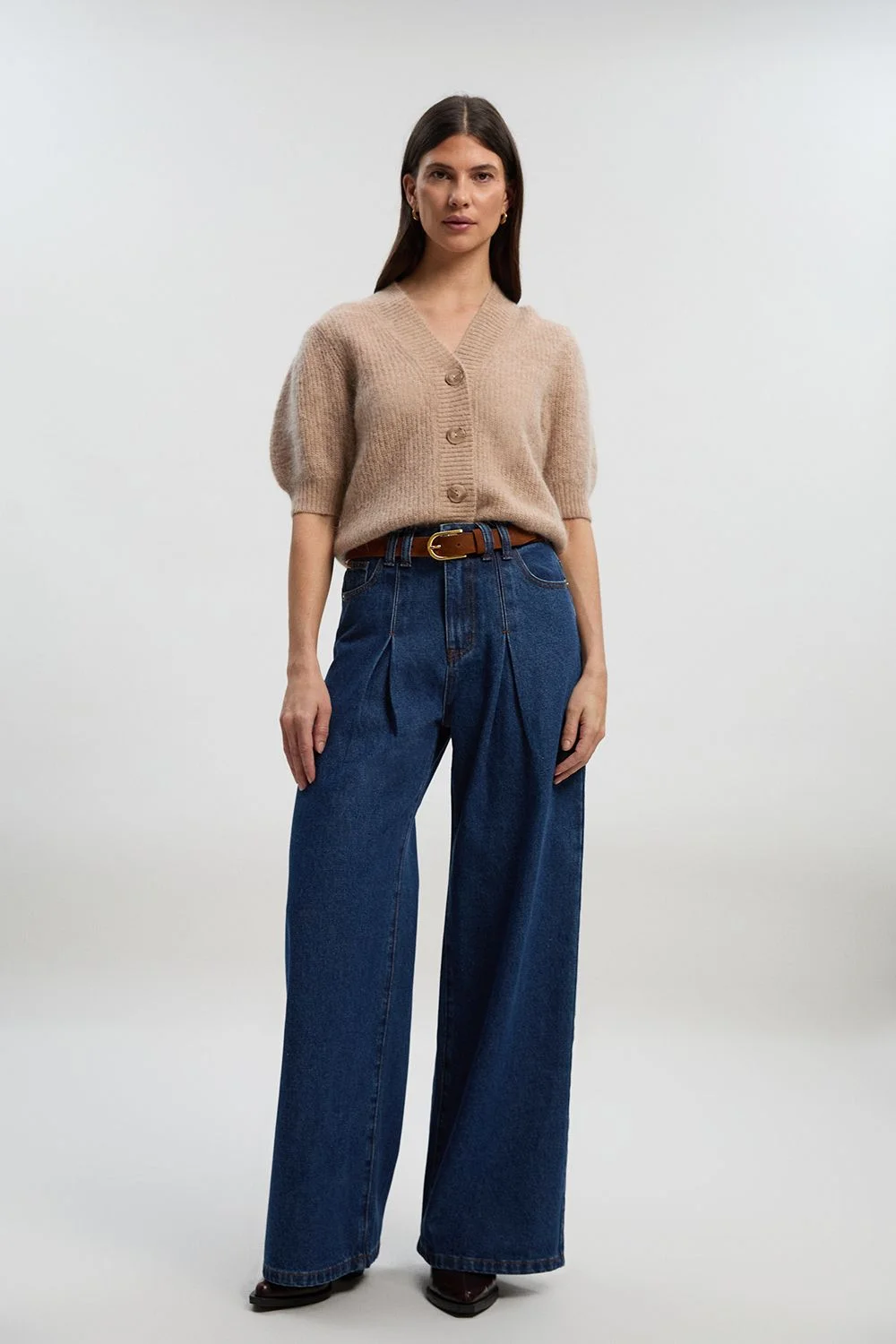 - Pleat front detailing adds sophisticated structure to these wide leg jeans - High-rise waistband with belt loops for versatile styling options - Wide leg silhouette creates a dramatic, flowing effect - Classic denim construction offers durability and timeless appeal - Generous 33cm inseam length provides elegant floor-skimming coverage These Karen Millen denim wide leg jeans combine contemporary styling with classic craftsmanship. The distinctive pleat front detail creates architectural interest while maintaining a polished silhouette. Style them for daywear with a simple fitted top and structured jacket as shown, adding a leather belt to define the waist. The generous wide leg cut makes these jeans perfect for casual gatherings or weekend brunches, pairing beautifully with both trainers for a relaxed look or ankle boots for added sophistication. The cotton-rich fabric ensures comfort throughout the day whilst maintaining shape. These versatile trousers transition effortlessly from shopping trips to family lunches, offering that coveted balance of comfort and refinement that forms the cornerstone of a well-curated wardrobe. The wide leg silhouette flatters various body types, making these jeans a wardrobe essential for the discerning woman. Product Details & Care Main: 59% cotton, 23% viscose, 18% polyester. Model wears UK8/US4. Model height 5"9. Inseam length: 33cm