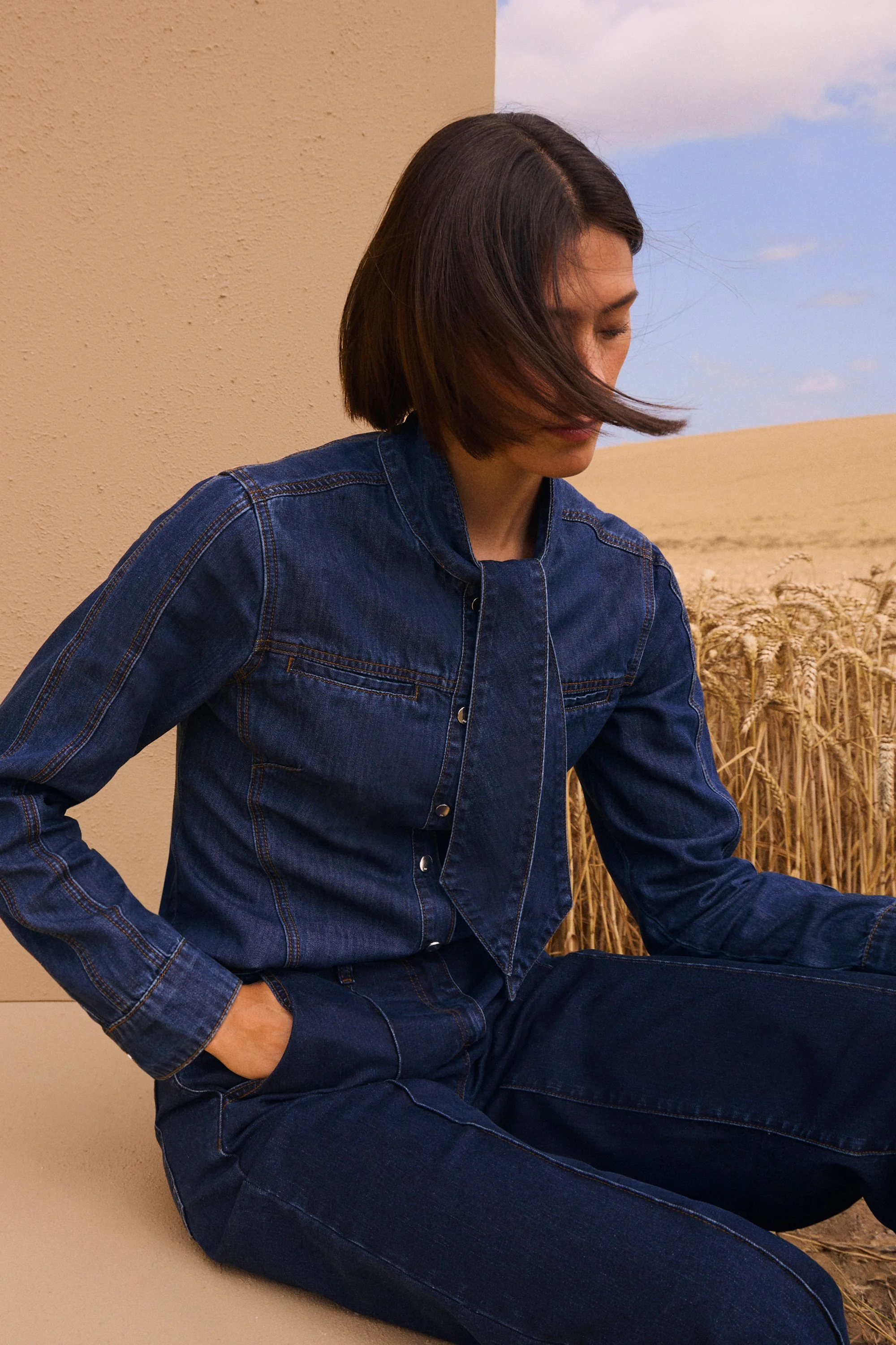 - Elegant pussy bow detail adds a feminine touch to classic denim styling - Distinctive horizontal chest seam detailing for contemporary design interest - Structured regular fit crafted from pure cotton for comfort and durability - Long sleeves with neat button cuffs for a polished finish - Versatile button-through front allows for multiple styling options This Karen Millen denim pussy bow blouse brilliantly bridges the gap between casual and refined daywear. The structured silhouette paired with the feminine bow detail creates a sophisticated yet relaxed aesthetic perfect for the modern woman. Style with high-waisted jeans and a leather belt as shown for an effortlessly coordinated denim-on-denim look that works beautifully for weekend brunches or casual office environments. The versatile design also pairs wonderfully with tailored trousers for a smart casual ensemble, or tucked into an A-line skirt for family gatherings. The cotton construction ensures breathability and comfort throughout the day, while the timeless denim fabrication promises longevity in your wardrobe. This piece embodies Karen Millen's commitment to contemporary pieces with expert craftsmanship, offering a polished yet accessible option for daytime styling. Product Details & Care 100% cotton, wash dark colours separately. 30 degree synthetic cycle. Do not tumble dry. Wash inside out. Model wears UK Size 8/ US Size 4. Model height approx: 5"9. Length approx: 63cm