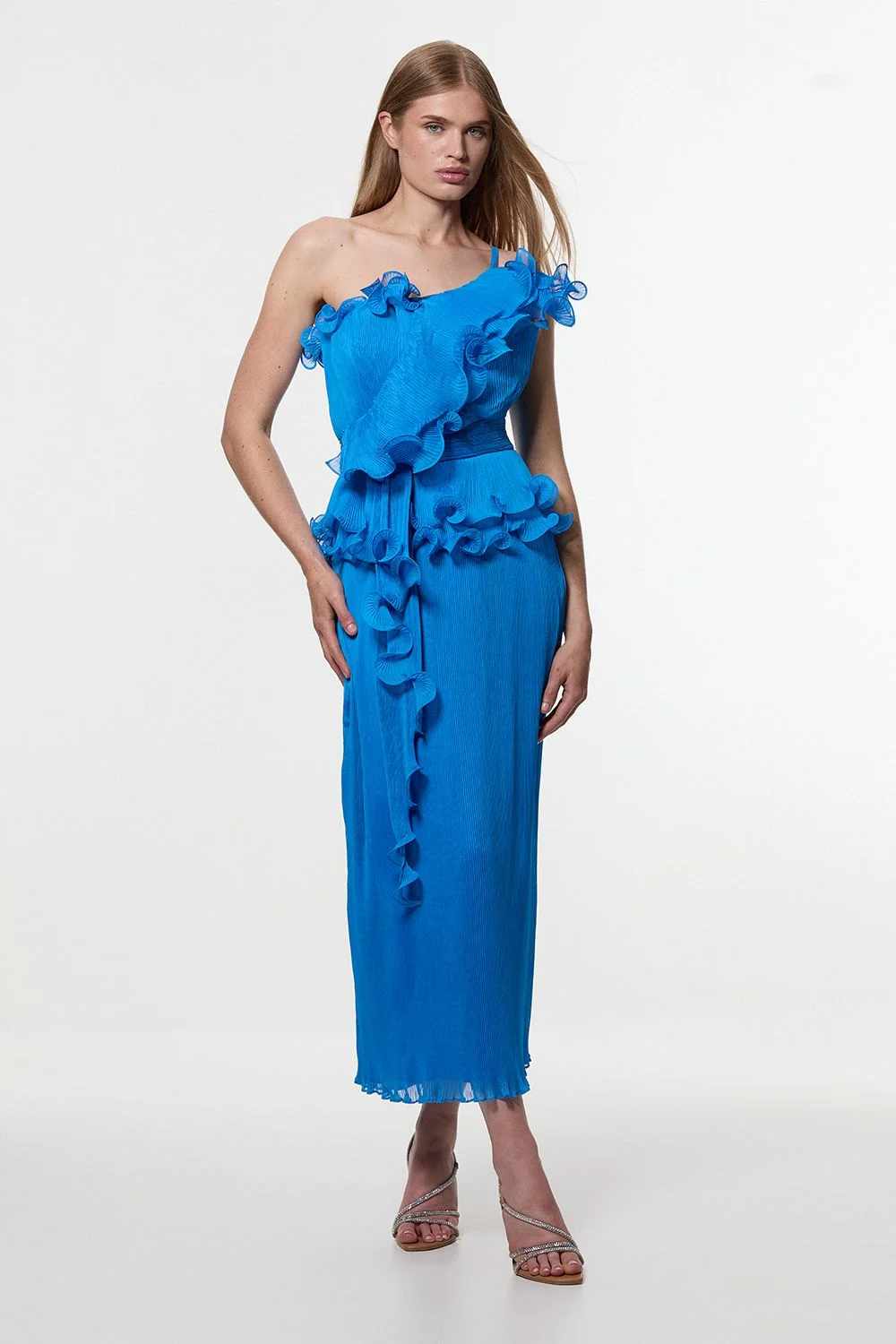 Drifting between reality and fantasy, this latest collection draws on the ethereal beauty of Millais' Ophelia. Rippling silhouettes flow with the ease of water; submerged blooms are transformed into artful prints. A bold stroke of cerulean blue pops against a whimsical palette of dewy pastels. The Digital Ophelia Midi Dress from Karen Millen presents a masterclass in contemporary occasion dressing. The strapless bandeau design showcases your decolletage beautifully, whilst the cascading ruffles create a captivating visual flow that demands attention. Perfect for summer weddings and formal garden parties, this dress requires minimal accessorising, simply pair it with strappy metallic heels as shown and delicate jewellery to maintain the dress as your focal point. The midi length strikes the perfect balance between formality and modern elegance, making this piece versatile enough for race day events, graduation ceremonies or sophisticated cocktail receptions. The textured georgette fabric catches the light as you move, ensuring you'll make a memorable impression at any special occasion. Strapless bandeau design with cascading ruffles Fine pleated crinkle georgette fabric Asymmetric ruffle detailing across the bodice and down the side Fitted waistline with peplum-style ruffle accentuating the feminine form Midi length with delicate pleated hem Product Details & Care 100% Polyester. Dry clean only. Model wears UK 8/US 4. Model Height 5"9. Length approx: 135cm