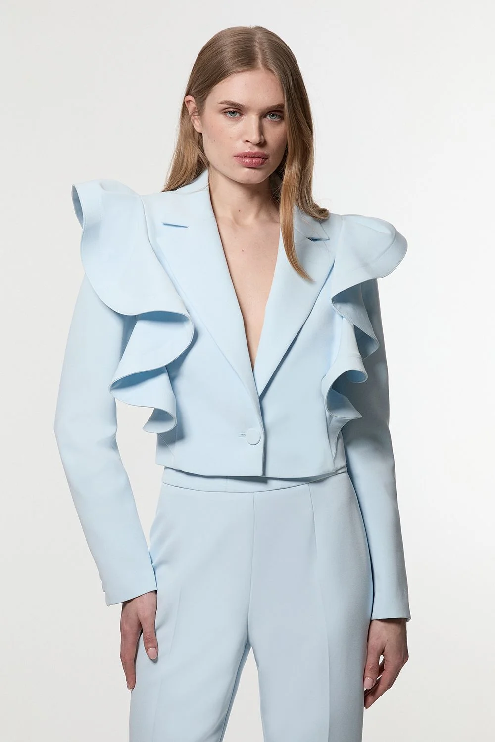 Make an unforgettable entrance with the Drama Ruffle Tailored Blazer from Karen Millen. This architectural masterpiece features an eye-catching ruffle detail that transforms a classic blazer into a contemporary statement piece. The cropped length creates a flattering proportion when paired with high-waisted trousers, as styled on our model. For formal occasions, style with matching tailored trousers and minimalist accessories to let the dramatic design take centre stage. The structured shoulders and clean lines offer a refined silhouette that commands attention at weddings, races or evening events. This versatile piece can also be dressed down with slim-fit jeans and heels for dinner dates or gallery openings. The regular fit ensures comfort without compromising on the blazer's show-stopping impact, making it a standout addition to your occasion wardrobe. Striking ruffle detail cascades dramatically across the collar and lapels Tailored single-breasted design with subtle button fastening Cropped length perfect for highlighting high-waisted bottoms Structured shoulders create a bold, architectural silhouette Luxurious satin fabric adds a sophisticated sheen to this statement piece Product Details & Care Main: 92% Polyester, 8% Elastane. Lining: 100% Polyester. Dry Clean only, Do Not Tumble Dry, Cool Iron . Model wears UK Size 8/ US Size 4. Model height approx: 5"9. Length approx: 50 cm