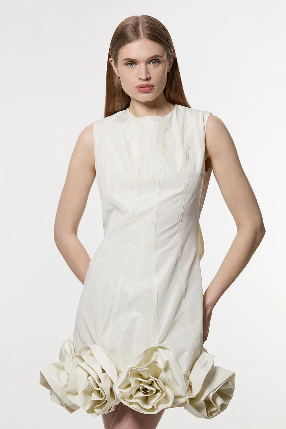 Make a statement at your next special occasion with this Karen Millen Drama Taffeta Rosette Woven Mini Dress. The architectural silhouette combines a sleek fitted bodice with show-stopping rosette embellishments that create a sculptural effect around the hemline. Style with strappy heeled sandals and drop earrings for a contemporary formal look. This dress is particularly well-suited for cocktail parties, engagement celebrations, and summer weddings where you wish to command attention. For cooler evenings, layer with a tailored blazer or an elegant wrap. The distinctive bow detail at the back provides an unexpected finishing touch that ensures you'll leave a lasting impression as you walk away. Striking taffeta mini dress featuring dramatic rosette detailing along the hemline Elegant bow detail at the back Sleeveless design with a refined crew neckline Structured silhouette with a flattering fitted bodice Product Details & Care Main: 100% Polyester. Lining: 100% Polyester. Wash inside out. Wash with similar colours. Iron on reverse. Do not bleach. Do not tumble dry. Model wears UK Size 8/ US Size 4. Model height approx: 5"9. Length approx: 89cm