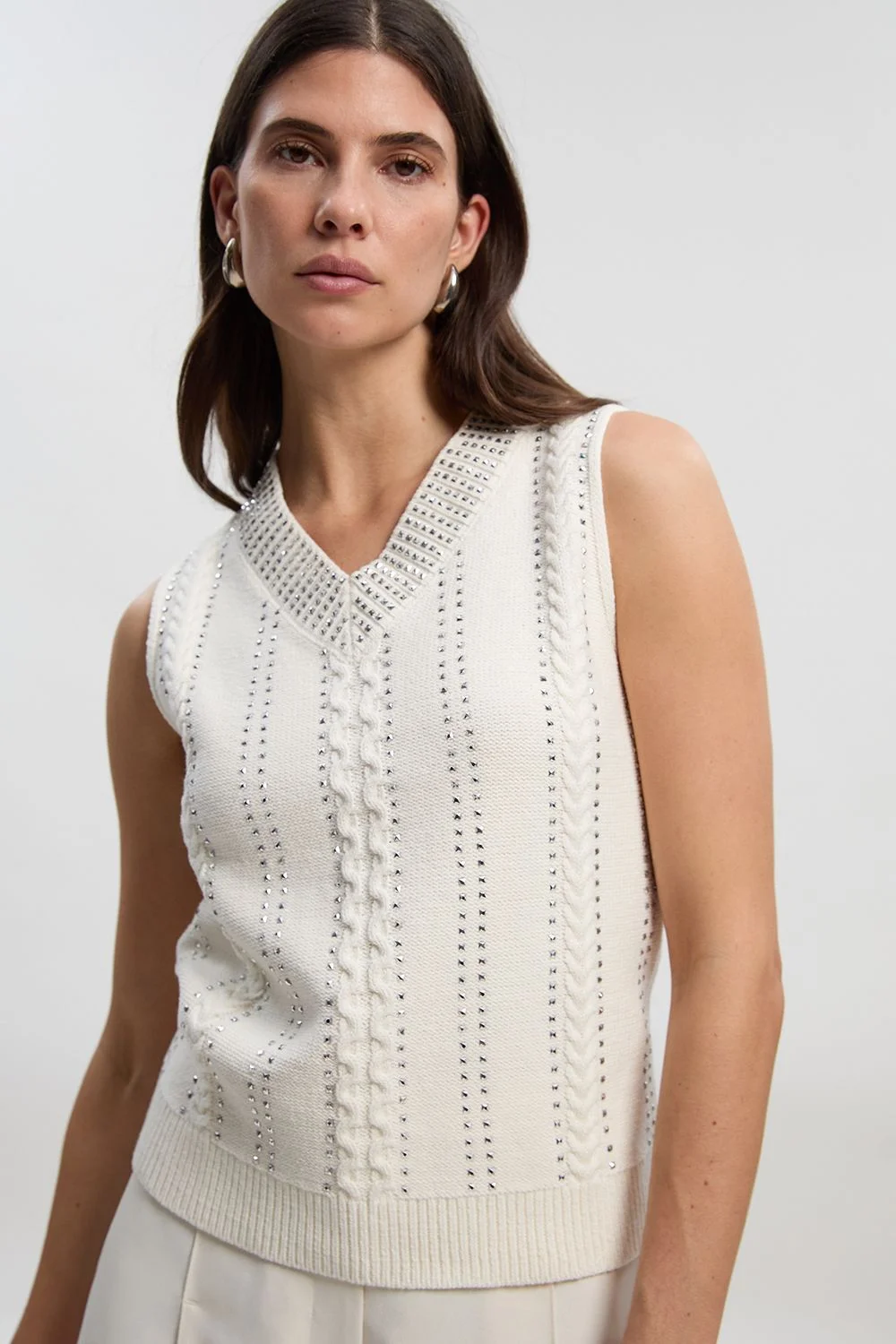- Striking hotfix embellishment creates a glamorous vertical pattern throughout - Elegant V-neckline with decorative embellished trim for added sophistication - Beautiful cable knit detailing adds texture and visual interest - Sleeveless tank design perfect for layering or wearing alone - Ribbed hem provides a flattering, structured finish This Karen Millen embellished knit tank combines contemporary style with timeless craftsmanship. The intricate hotfix detailing catches the light beautifully, whilst the textured cable knit pattern adds depth and dimension. Style this versatile piece with your favourite denim for casual coffee dates, or pair with tailored trousers and a blazer for a more polished daytime look. The loose fit ensures all-day comfort without compromising on style, whilst the V-neckline frames your decolletage perfectly. This tank transitions effortlessly from weekend brunches to family gatherings, making it a wardrobe essential for the sophisticated woman who values both comfort and elegance. Layer under a cardigan when the temperature drops or wear alone with statement jewellery to showcase the beautiful embellishment detail. Product Details & Care Main: 60% Cotton, 40% Acrylic excluding trims. Machine wash. Reshape whilst damp. Models wears UK size Small. Models height approx: 5"9.
