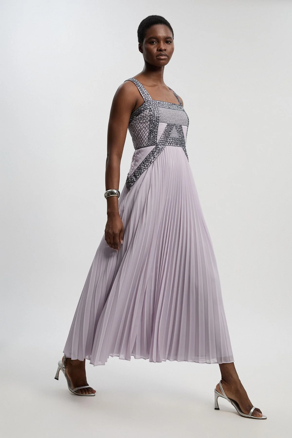 - Bardot neckline with elegant embellished bodice creating a striking contrast against the flowing skirt - Intricate beadwork detailing across the structured upper section for a touch of sophistication - Dramatic pleated woven skirt that creates movement and dimension - Maxi length design perfect for formal occasions - Flattering silhouette with defined waistline that enhances your natural shape This embellished pleated maxi dress exemplifies refined elegance with its striking contrast between the ornate beaded bodice and flowing pleated skirt. The Bardot neckline frames the decolletage beautifully, while the structured upper section provides a flattering foundation. Style with metallic strappy heels and a sleek bracelet for weddings or formal gatherings, allowing the dress to command attention. For race day events, pair with a coordinating fascinator and clutch bag for a polished ensemble. The ankle-grazing length offers versatility for various occasions throughout the season, from summer garden parties to evening receptions. This Karen Millen piece embodies contemporary sophistication with its expert craftsmanship and attention to detail, making it a standout addition to your occasion wardrobe that will remain timeless for years to come. Product Details & Care Main: 100% polyester Lining: 100% polyester. Machine wash only. Model wears UK 10/US 6. Model's height approx. 5'9" Length approx. 135cm